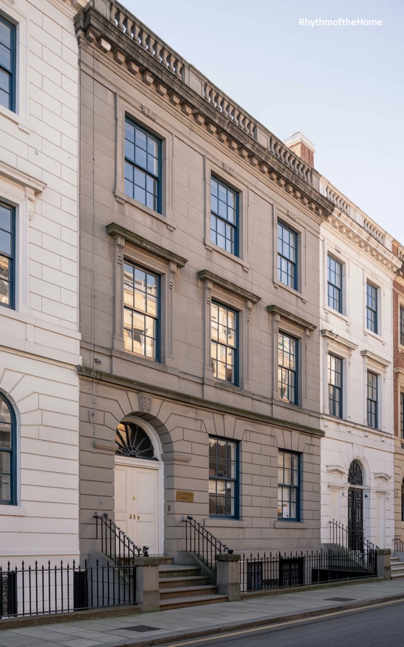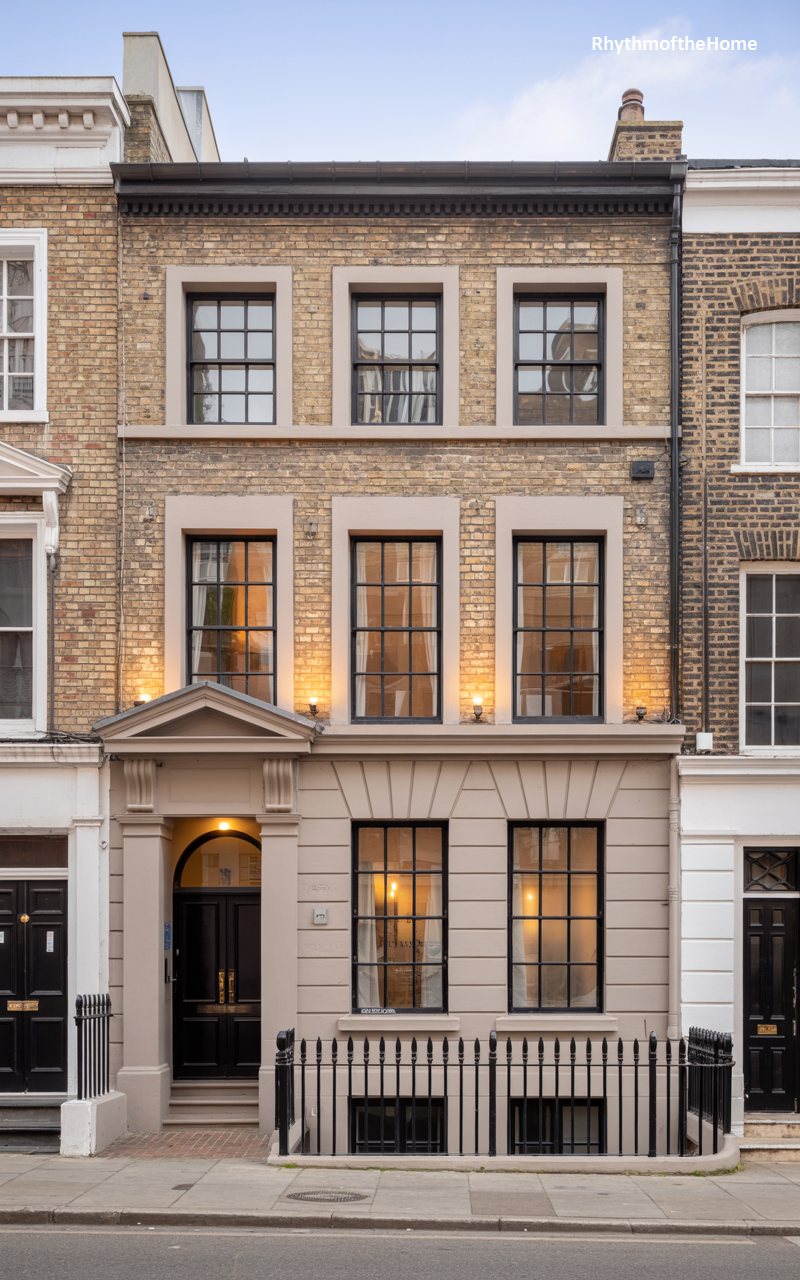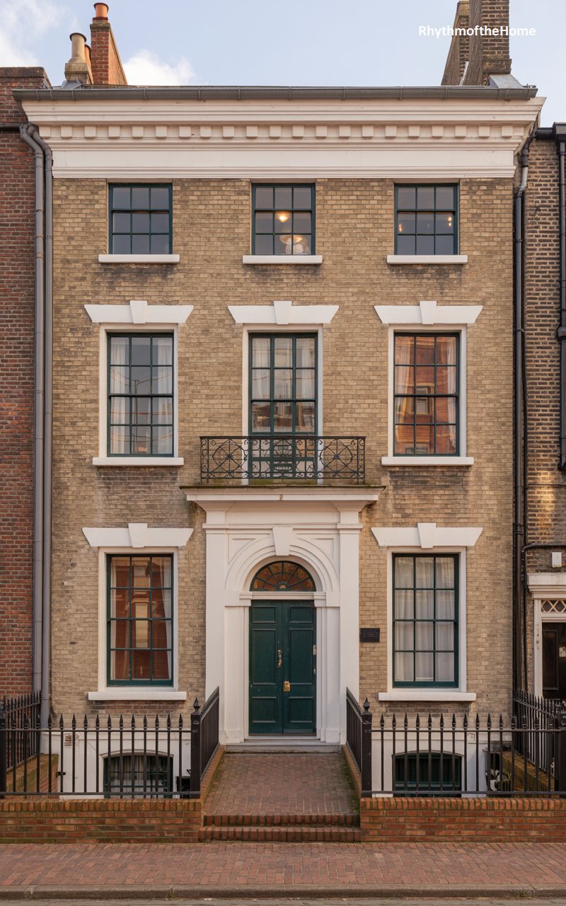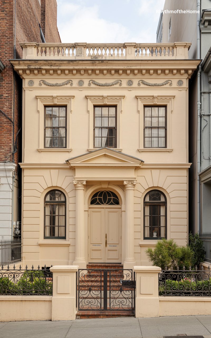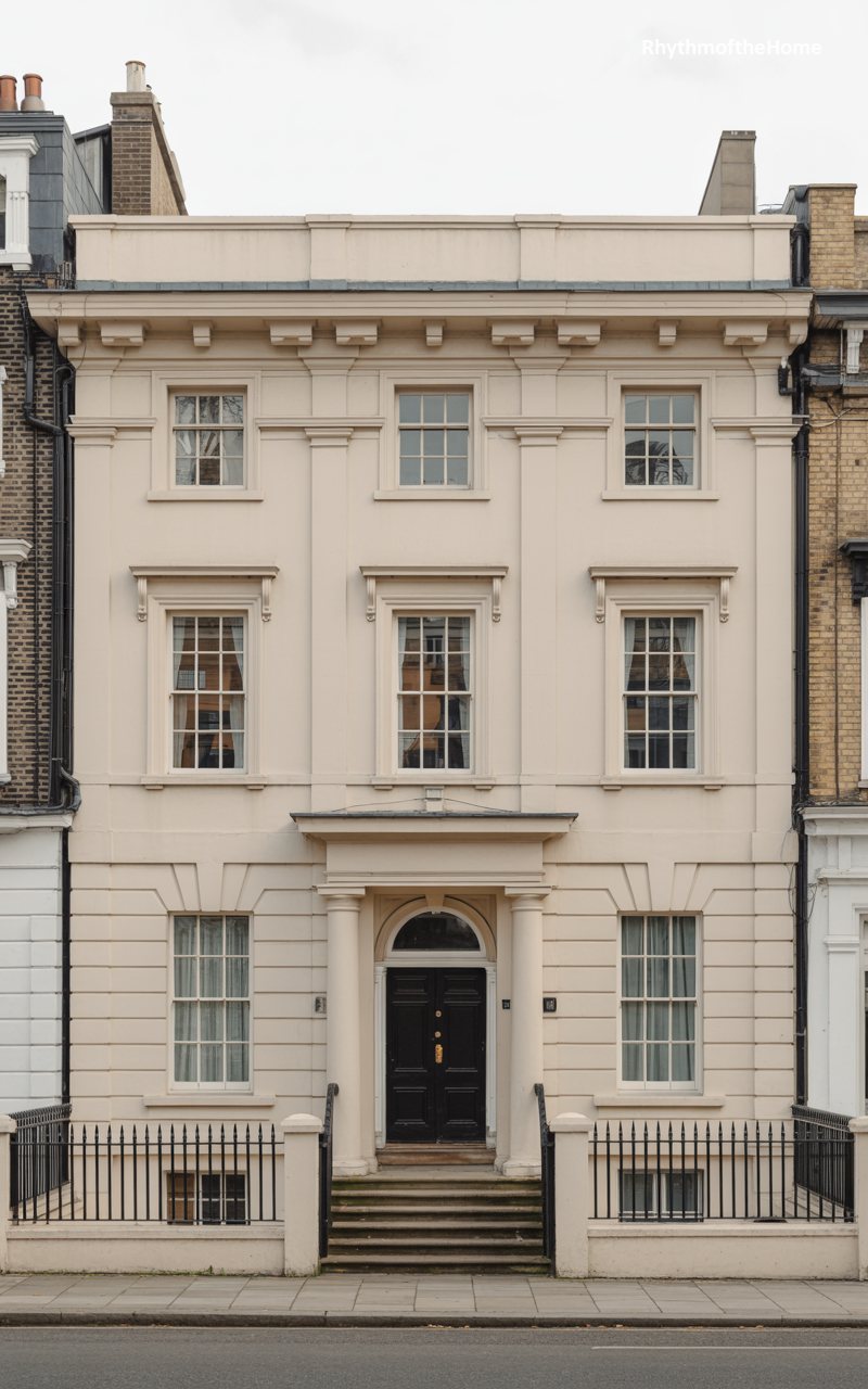 This three-story cream stucco residence mimics the style of a London terrace house or a Regency-era townhome. The façade is smooth and disciplined, divided by shallow pilasters that draw the eye upward. The ground floor features rusticated detailing, anchoring the building visually. A classic black door with a semi-circular fanlight sits at the top of a short flight of steps, guarded by black iron railings. The windows are tall and narrow, typical of the style, designed to let in light while maintaining privacy. It is a refined, vertical slice of architecture that feels sophisticated and urbane.
