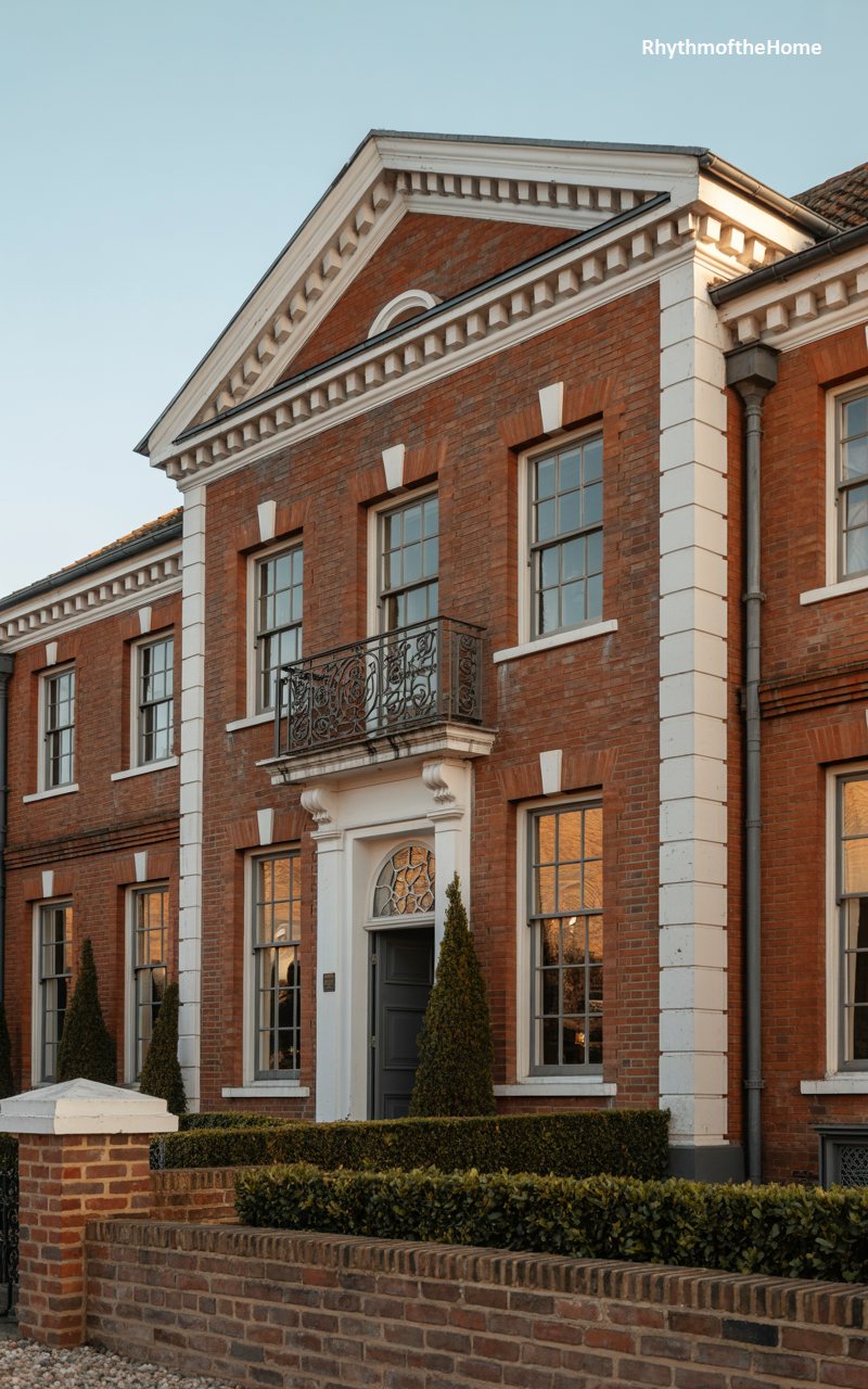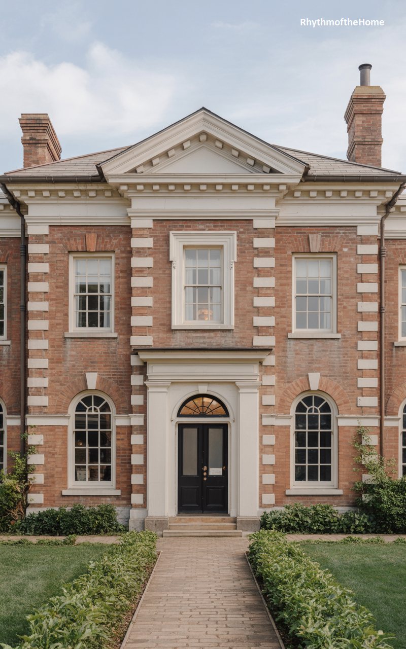 This majestic estate makes a bold statement with its striking combination of warm red brick and stark white stone dressings. The corners are emphasized by heavy rusticated quoins, while the central bay projects forward, capped by a commanding triangular pediment. The ground floor features elegant arched windows that echo the curve of the fanlight above the black front door. Stone balustrades and cornices add layers of classical detail to the composition. It is a home of significant architectural weight, designed to impress with its rich materials and adherence to the strict rules of Georgian proportion and symmetry.