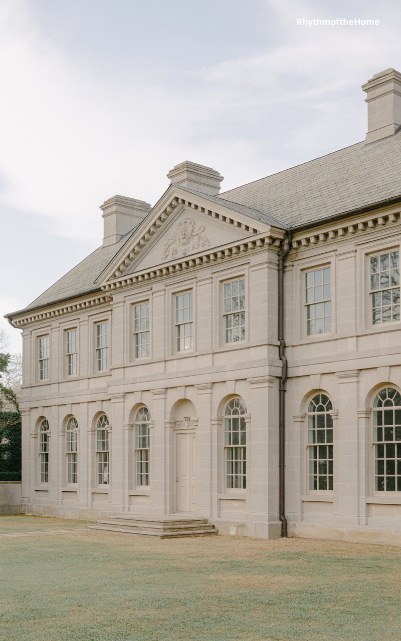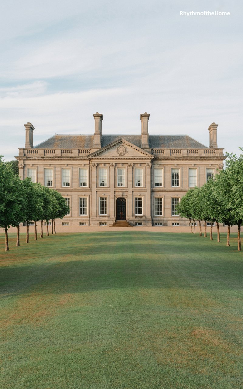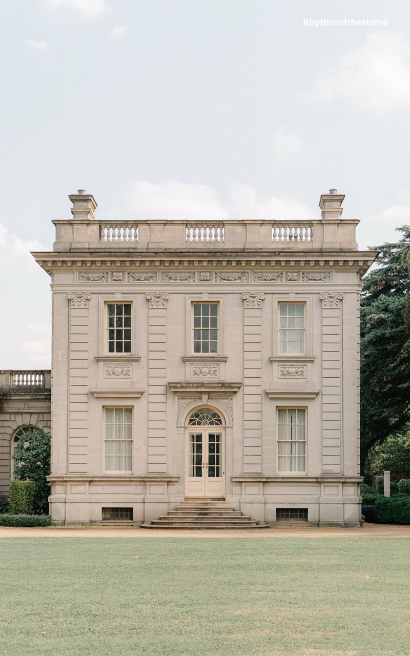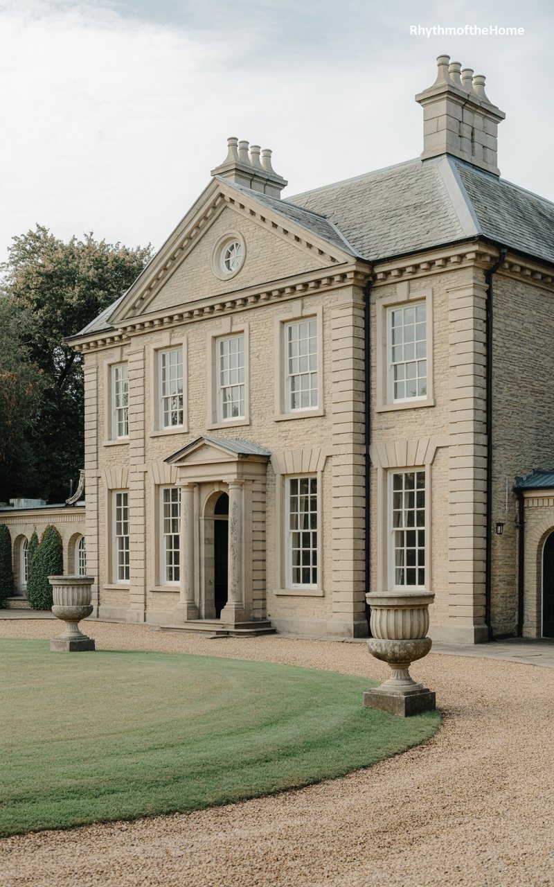 This home is a masterclass in Palladian proportions, constructed from pale, sandy brick or stone. A central pediment sits atop a slightly projecting bay, emphasizing the entrance. The windows are generously sized with white surrounds, flooding the interior with light. The front door is recessed within an arched opening, flanked by columns that give it a temple-like appearance. Stone urns on pedestals grace the lawn, adding a layer of formal garden statuary to the scene. The house feels airy and light despite its size, achieved through the use of pale materials and harmonious, balanced geometry.