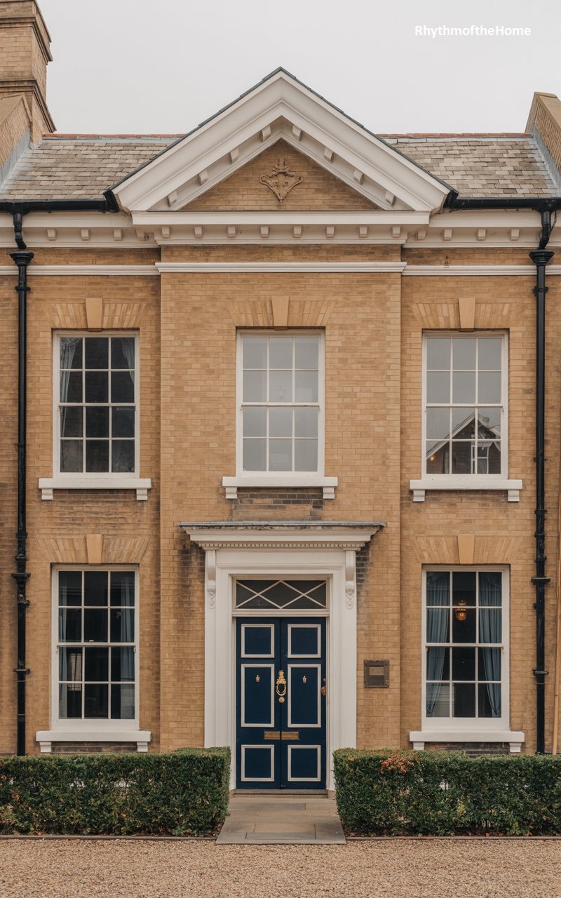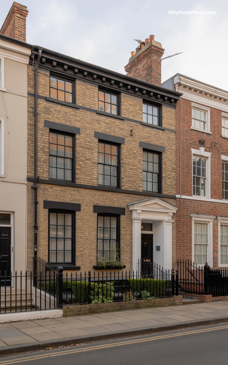 This townhouse facade is a beautiful example of urban Georgian design, utilizing yellow “London stock” brick. The brickwork creates a warm, textured surface that contrasts with the dark paint of the window frames and cornice. Three rows of sash windows diminish slightly in height as they ascend, a trick of perspective often used to make buildings appear taller. A white classical portico with columns frames the black front door, adding a touch of ceremonial grandeur to the street entrance. Black iron railings along the sidewalk complete the historic, city-dwelling look.