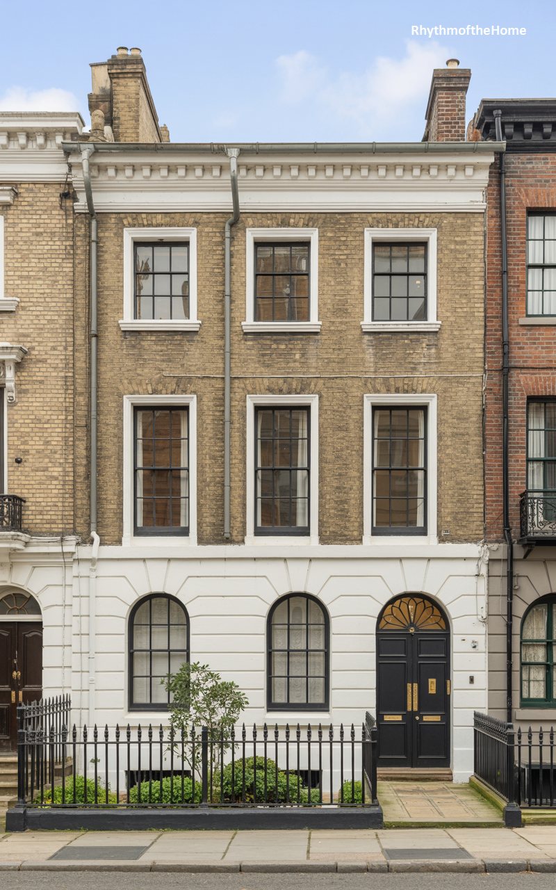 This townhouse is constructed from “London stock” brick, characterized by its distinctive yellowish-brown tone. The white stucco detailing on the ground floor creates a bright base for the building, featuring arched windows and a matching arched doorway. The door itself is black and glossy, a traditional choice that adds depth. The upper floors feature tall, rectangular sash windows with simple white headers. Black iron railings fence off the basement area and the street, adding a graphic linear element. It represents the quintessential city row house, efficient in its footprint but elegant in its execution and classical detailing.
