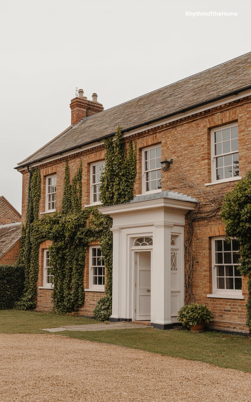 Nature and architecture merge in this charming brick home, where thick vines of ivy creep up the façade, softening the hard edges of the masonry. The brick is an orange-red hue, warm and inviting. A crisp white portico defines the entrance, standing out brightly against the darker brick and green foliage. The windows are traditional white sashes, reflecting the sky. A gravel driveway fills the foreground, providing a crunchy, textural contrast to the soft grass and smooth brick. The house feels organic and established, as if it has grown out of the landscape over many decades.
