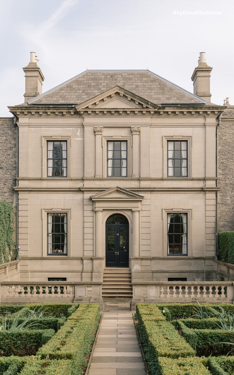 Solid and imposing, this stone-faced home exudes a sense of serious formality. The stone is grey and smooth, giving the building a monolithic quality. The windows are framed in dark metal or painted wood, contrasting with the light stone. A central arched doorway provides a deep, shadowed entry point. The landscaping is incredibly precise, with low boxwood hedges creating a geometric parterre garden in the foreground. The house feels almost institutional in its severity and precision, yet the residential scale and the warmth of the interior lighting soften it into a grand, private home.