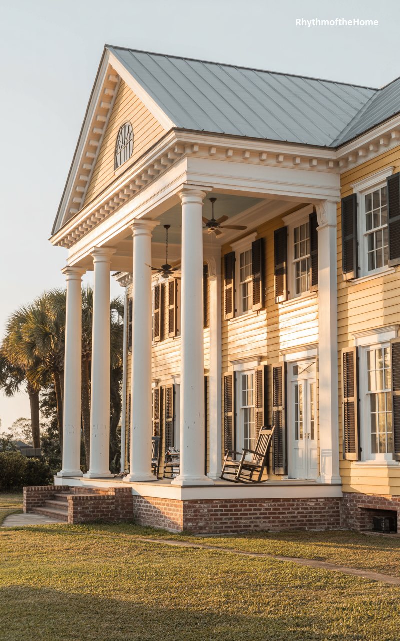 Bathed in the golden glow of a setting sun, this yellow clapboard home captures the essence of Southern hospitality and grace. The structure is defined by its massive, two-story white columns that support a broad portico, creating a deep, shaded veranda perfect for escaping the heat. A collection of rocking chairs sits invitingly on the porch, suggesting lazy afternoons spent watching the world go by. The pale blue ceiling of the porch—a traditional “haint blue”—contrasts beautifully with the sunny siding. Surrounded by palms and lush grass, the home feels breezy, open, and deeply connected to its landscape.