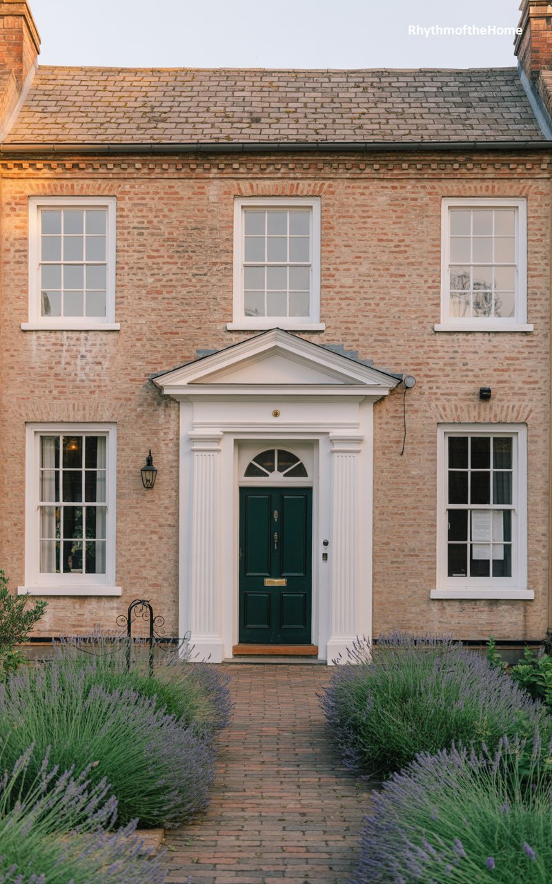 This delightful home features a textured, mottled brick façade that ranges in color from pink to tan. The white trim is substantial, particularly the door surround which features a pediment and fluted pilasters. The dark green door adds a classic touch of color. What truly sets this image apart is the lush planting of lavender in the foreground, washing the bottom of the frame in purple hues and suggesting a fragrant approach to the home. The combination of the rustic brick, the crisp white joinery, and the wild, soft garden creates a romantic and welcoming atmosphere.