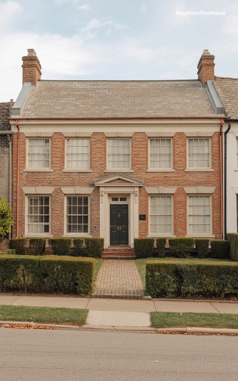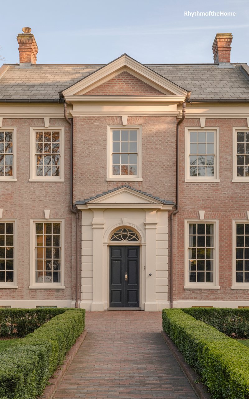 This home is a textbook example of Colonial Revival perfection. The brick is a consistent, light red, laid with precision. The façade is perfectly symmetrical, with a central projecting bay topped by a pediment. A handsome white door surround with a fanlight serves as the centerpiece, flanked by tall, narrow windows. The roof is hipped and covered in grey slate, with two small chimneys at the peak. A brick path leads straight to the door, bordered by low, meticulously clipped hedges. It is a house that values order, balance, and tradition above all else, presenting a flawless face to the world.