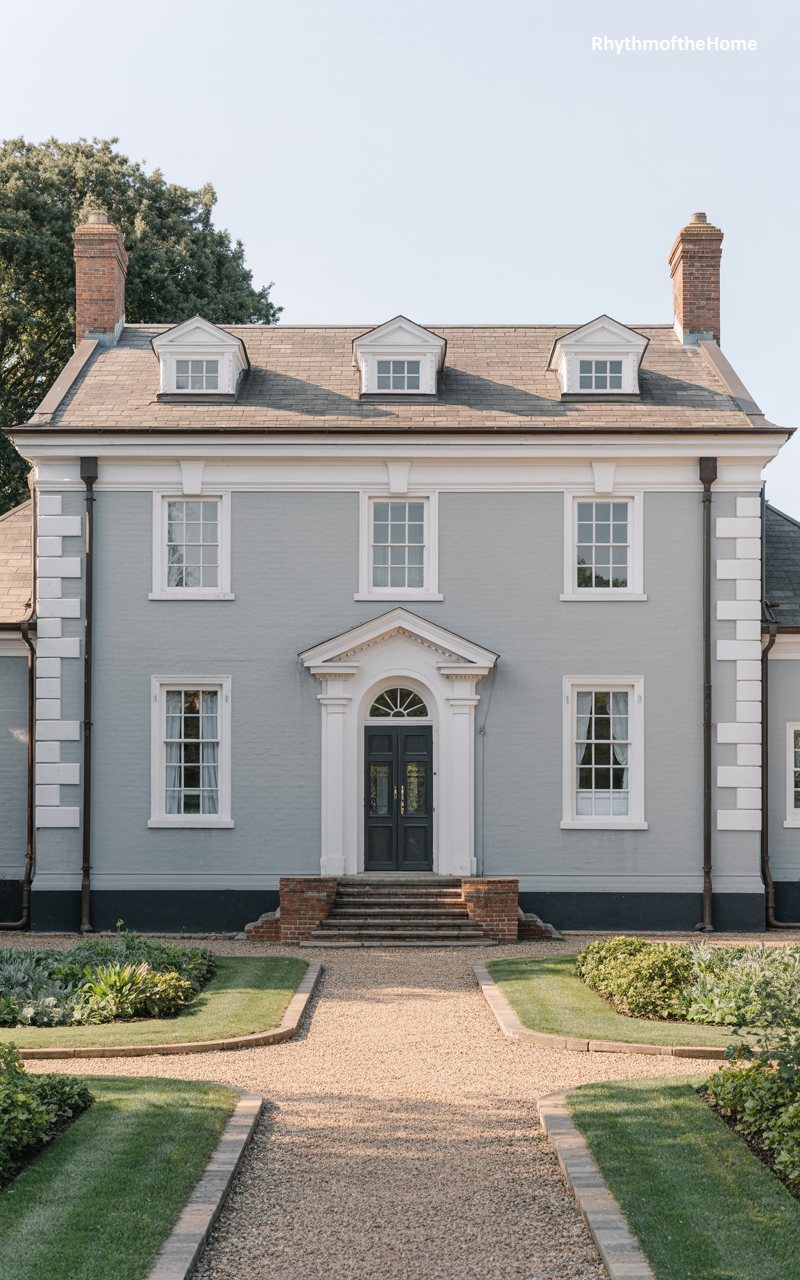 Painted a serene shade of blue-grey, this home combines approachability with formal structure. Crisp white quoins mimic heavy stone blocks at the corners, framing the brickwork and contrasting beautifully with the cool siding color. Three dormer windows perch atop the slate roof, adding charm and light to the upper level. The central entrance is highlighted by a classic white pediment and pilasters, standing as a welcoming focal point. A wide gravel path leads the viewer through lush garden beds, inviting them toward the front door. The overall effect is one of calm elegance, blending traditional architectural solidity with a soft, soothing palette.