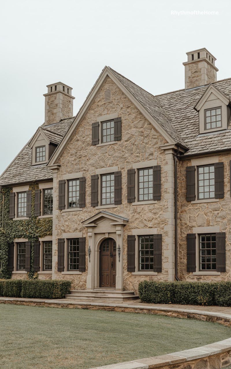 This residence departs from traditional brick or wood, opting instead for a textured stone façade that gives it an air of permanence and history. The irregular shapes of the stones create a mosaic of earth tones, softened by creeping ivy that claims the left side of the house. Dark, louvered shutters frame the windows, grounding the lighter stone with visual weight. The roofline is complex, with steep gables and stone chimneys that suggest cozy hearths within. A dignified arched doorway serves as the focal point, promising a heavy, secure entrance into a home that feels like a fortress of comfort.