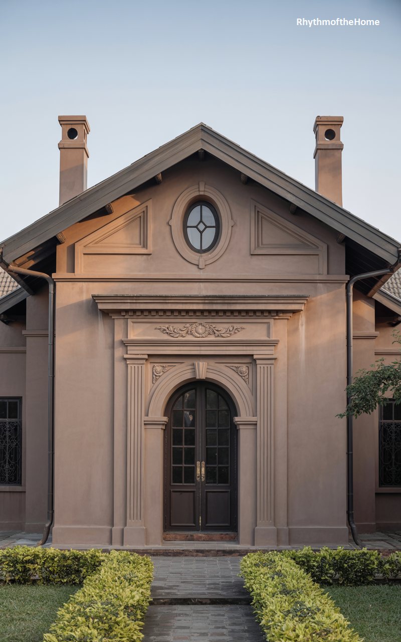 Standing with a unique, earthy presence, this home features a smooth stucco facade painted a warm cocoa-brown. The structure is dominated by a central gable that houses a charming oval window, reminiscent of a classical oculus. The entrance is deeply recessed within a grand archway, featuring dark double doors that add a touch of mystery and depth. Classical pilasters and a decorative frieze frame the entry, adding architectural sophistication to the simple geometric form. Flanked by tall, symmetrical chimneys, the house feels grounded and solid, offering a distinct, almost experimental take on the traditional Colonial form.