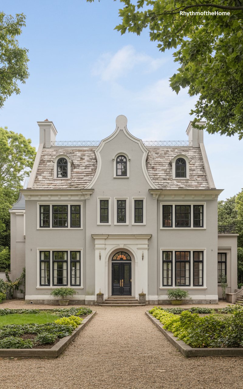 This residence is defined by its striking curvilinear gable, a hallmark of the Dutch Colonial style, which rises gracefully above the roofline to create a distinct silhouette. The facade is a smooth, pale grey stucco that serves as a neutral backdrop for the dark, multi-paned windows. Dormer windows break up the slate roof, adding domestic charm to the upper story. The arched front entrance, set within a classical surround, anchors the composition. A pristine gravel driveway sweeps towards the house, bordered by low greenery. It is a whimsical yet stately home, combining the playfulness of the shaped gable with the seriousness of classical detailing.