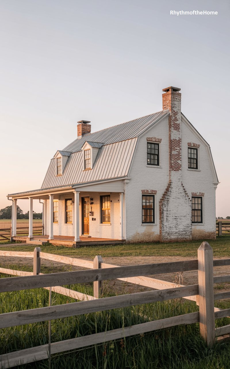 Bathed in the warm, golden light of sunset, this white painted brick farmhouse exudes pastoral tranquility. It features a distinctive gambrel roof clad in standing seam metal, offering a modern durability to the traditional barn-like form. A wide, inviting porch spans the front, supported by simple columns, perfect for surveying the surrounding fields. Brick chimneys rise from the gable ends, hinting at warmth within. A rustic wooden fence lines the foreground, underscoring the home’s connection to the land. It is a picture of rural Americana, blending humble materials with a noble, timeless silhouette that feels completely at home in the countryside.