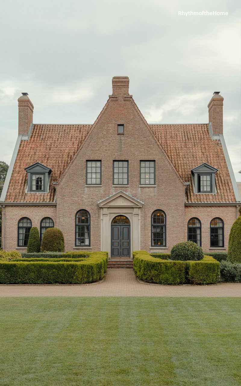 Steep, red-tiled roofs and a towering central gable define this imposing brick manor. The architecture borrows from earlier European traditions, featuring sharp angles and substantial massing that command attention. Dark, arched windows puncture the brick facade, adding a sense of rhythm and depth to the masonry. The entrance is framed by a stone surround, leading into a heavy wooden door. In the foreground, a meticulously clipped boxwood parterre garden mirrors the geometric precision of the house. It feels like an estate rooted in history, solid and unyielding, offering a sanctuary of order and traditional beauty behind its thick walls.