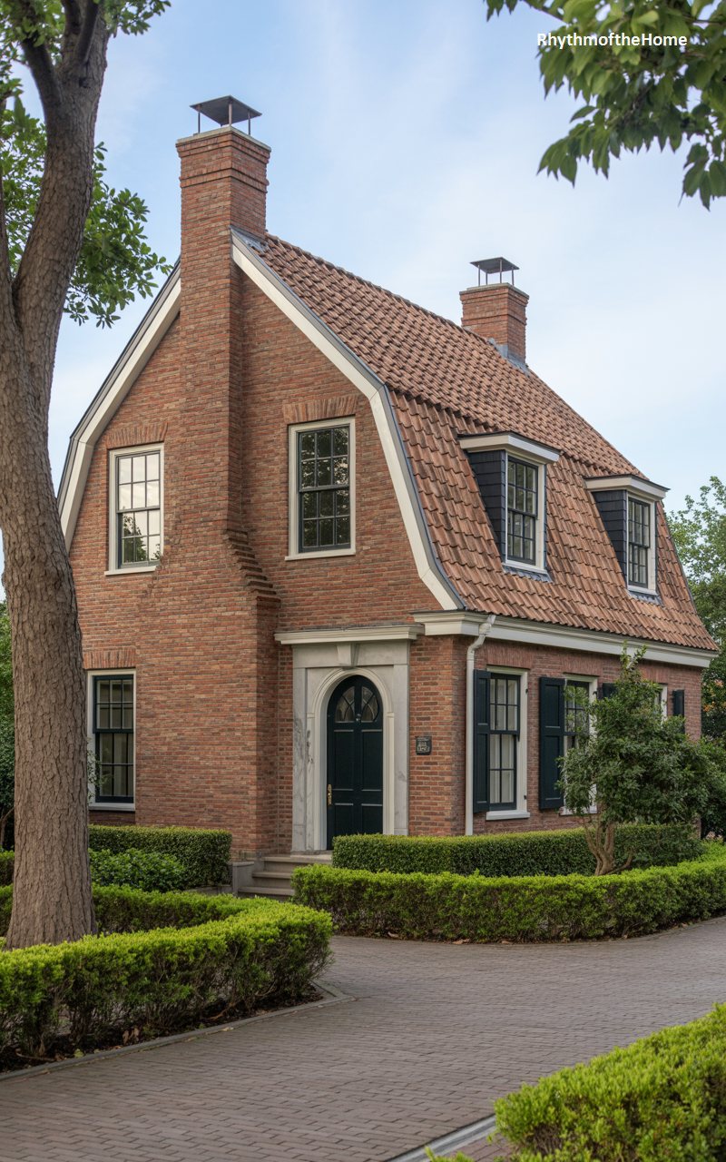 A robust example of Dutch Colonial architecture, this home is constructed entirely of red brick, giving it a unified, textured appearance. The steep gambrel roof is covered in matching red clay tiles, creating a monochromatic warmth that stands out against the blue sky. A massive brick chimney anchors one side, suggesting a large hearth and sturdy construction. The entrance is marked by a stone surround and an arched door, reached via a paved brick driveway. Surrounded by low, neat hedges, the house feels compact yet incredibly sturdy, a testament to the enduring appeal of brick craftsmanship.
