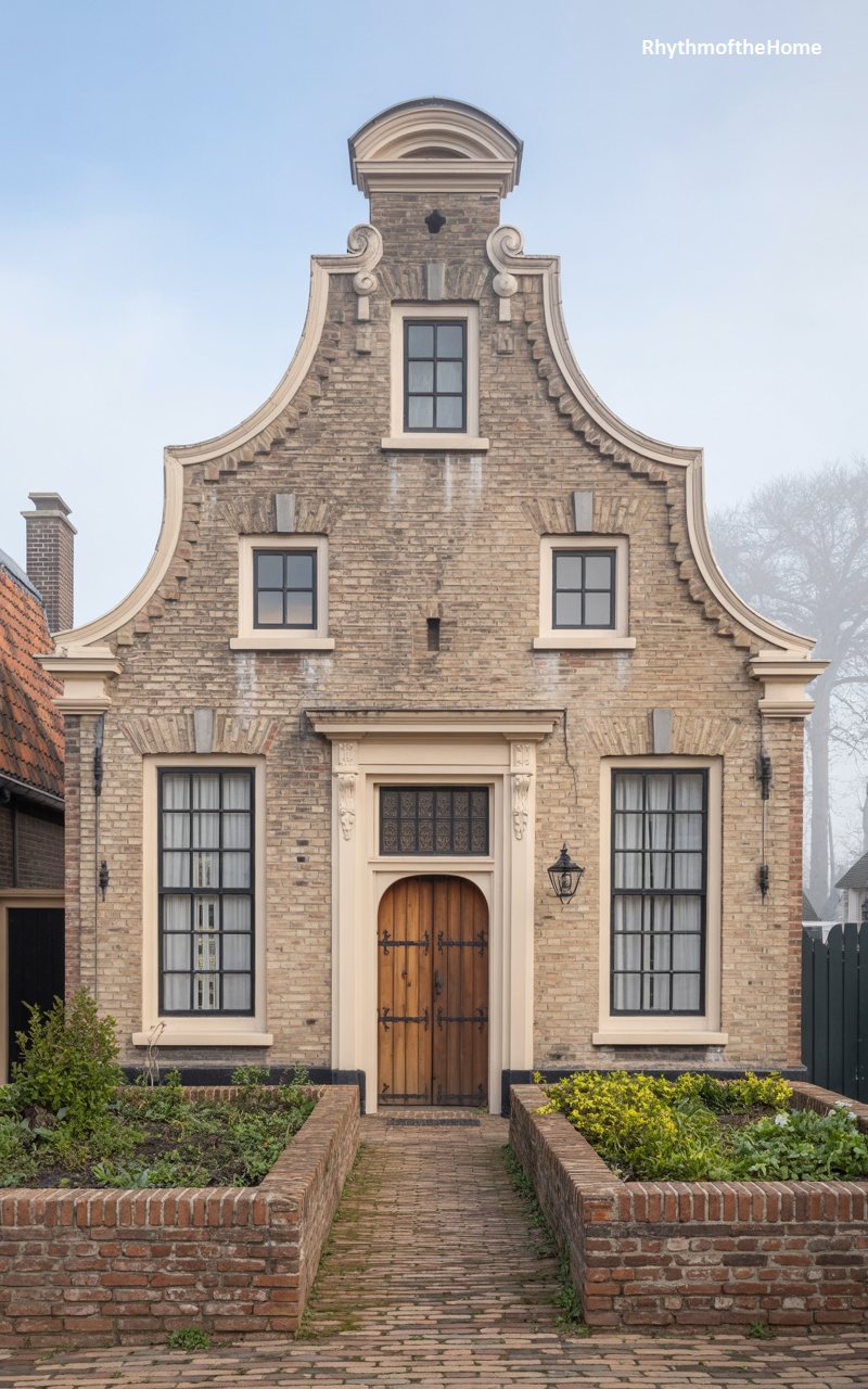 This distinctive brick home features a dramatic, shaped gable that soars upward, culminating in a decorative curved pediment. The brickwork is varied in tone, creating a rich, aged patina that speaks of history. The facade is marked by a playful arrangement of windows—smaller square ones at the top and tall, narrow ones flanking the entrance. The wooden front door is arched and heavy with iron hinges, set within a cream stone surround. Raised brick planters filled with greenery frame the entrance path, grounding the verticality of the architecture. It is a unique, character-filled structure that feels plucked from a historic Dutch village.