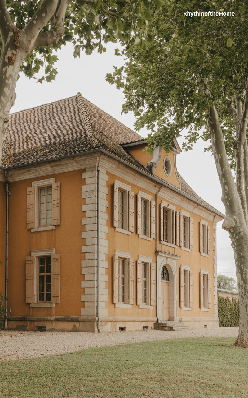 Radiating warmth with its rich ochre stucco facade, this home feels like a sun-drenched manor in the countryside. The hipped roof is covered in weathered tiles, extending over the eaves to protect the walls. Stone quoins anchor the corners, adding structural definition to the vibrant plaster. Wooden shutters flank the tall windows, hinting at a need for shade from the summer sun. An arched doorway sits centrally, simple yet inviting. Framed by the trunk of a massive plane tree, the house has an air of rustic nobility, suggesting long, lazy afternoons and a connection to the warmth of the earth.