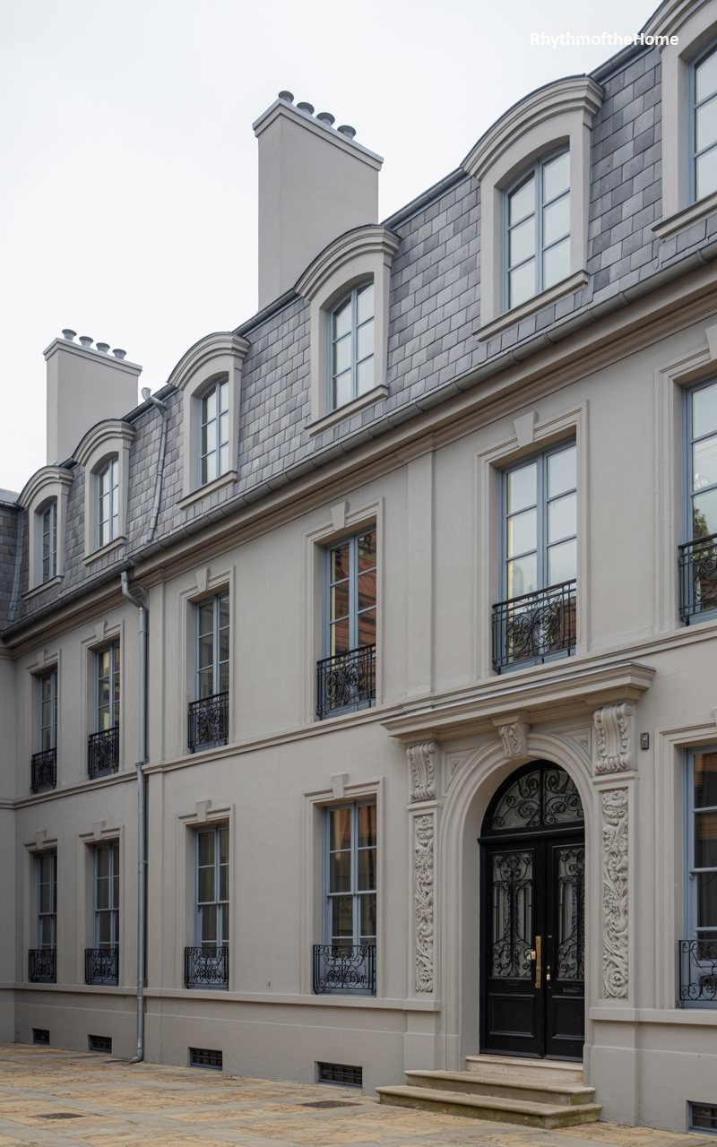 Sophisticated and urban, this grey stucco residence features a steep mansard roof that adds a layer of French flair to the Colonial form. The facade is disciplined and flat, relieved by the decorative wrought iron railings on the second-story balconies. The entrance is a grand archway with intricate ironwork on the glass doors, set within a detailed stone frame. The windows are tall casements, designed to flood the interior with light. Standing on a paved courtyard, the building feels private and exclusive, an elegant retreat designed for refined city living.