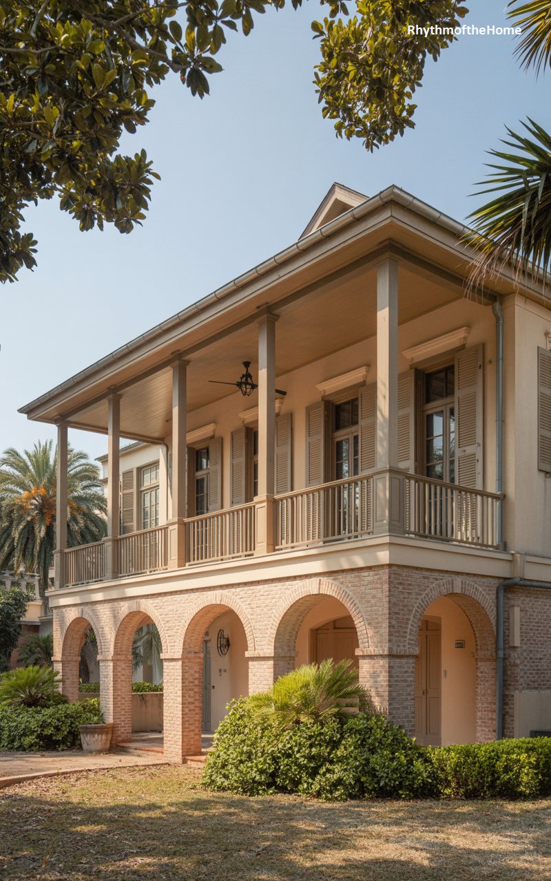 Evoking the breezy style of the West Indies or the Deep South, this home is raised high on a series of brick arches, creating a shaded undercroft. The main living level is wrapped in a deep, covered veranda supported by simple columns, perfect for catching cross-breezes. Louvered shutters cover the French doors, offering protection from the sun and storms. The palette is a soft tan, blending with the sandy soil and palm trees that surround it. It is a home designed for a warm climate, prioritizing shade, airflow, and a relaxed, indoor-outdoor lifestyle.