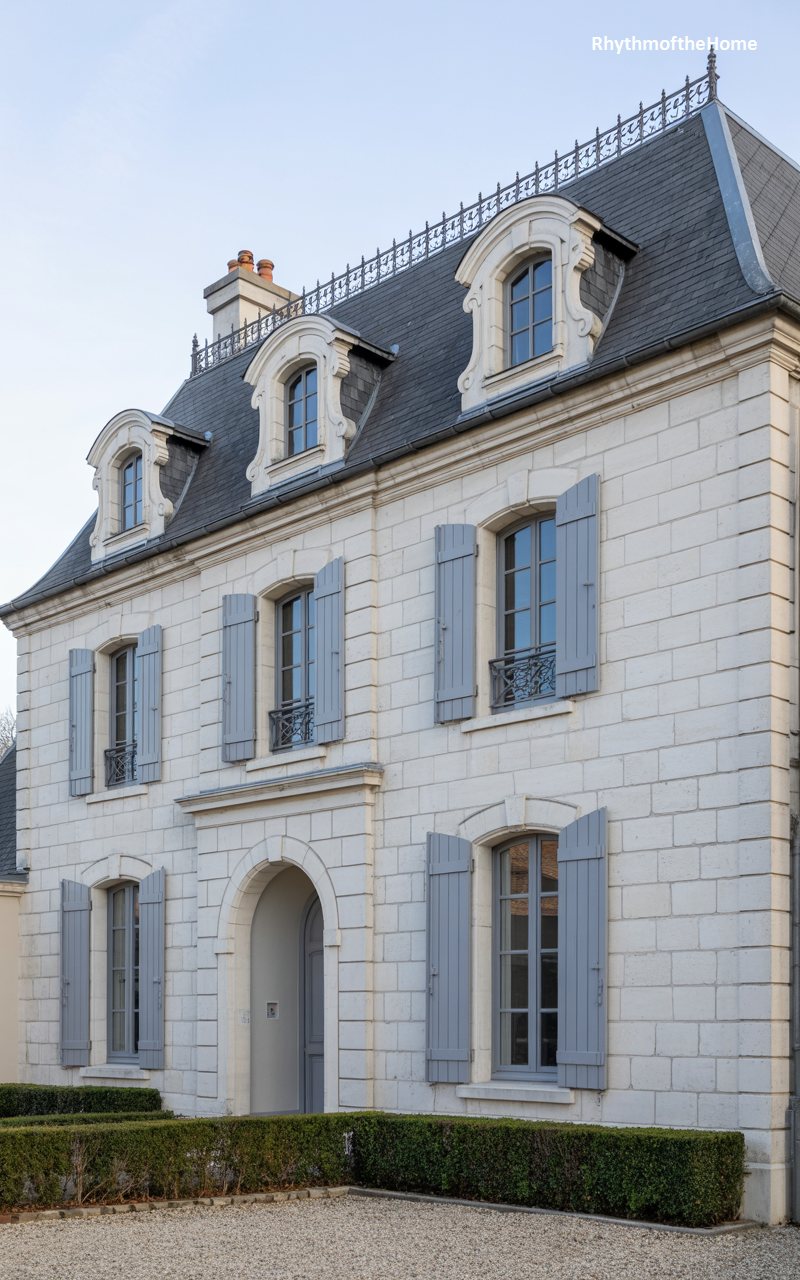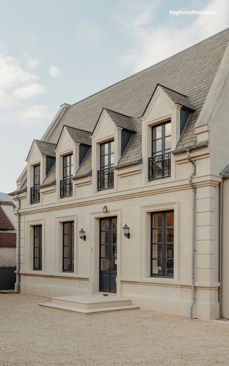 This residence exudes the stately charm of a French country estate or manor. Constructed from pale limestone blocks, the facade is characterized by its rigorous symmetry and sense of permanence. The steep, slate-tiled roof is punctuated by three prominent dormer windows with sharp, triangular pediments. Below, tall casement windows with dark frames are adorned with decorative iron railings on the upper level. The entrance is subtle yet elegant, centered between the windows. A copper rain gutter system adds a functional yet decorative vertical element. The gravel courtyard in front completes the European aesthetic, suggesting a home of history and refinement.