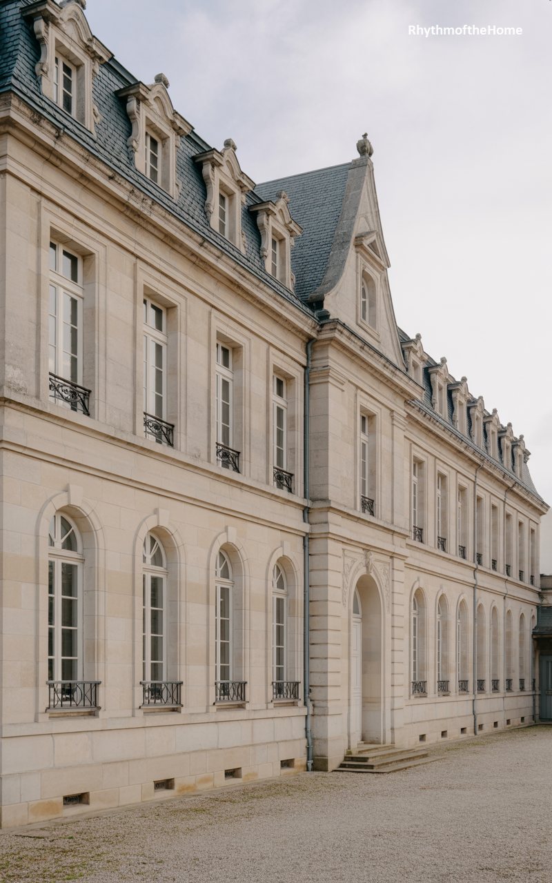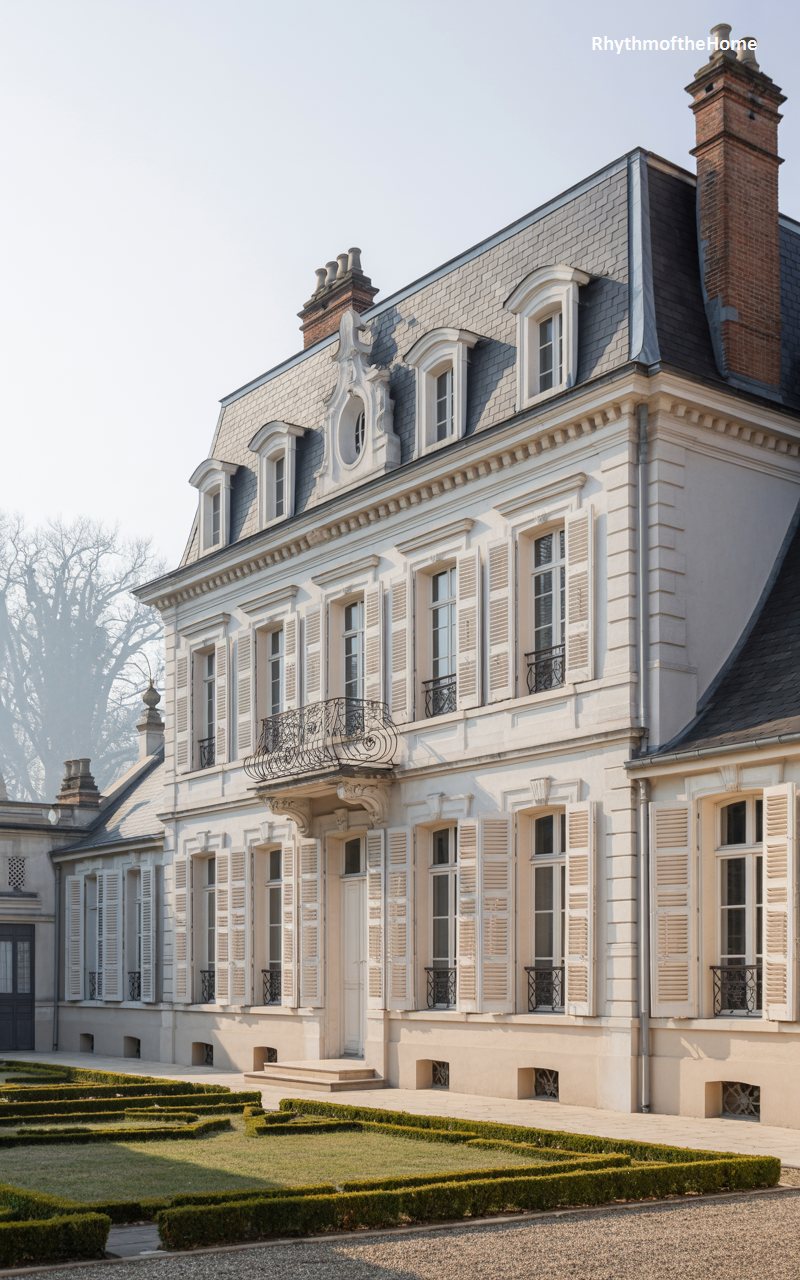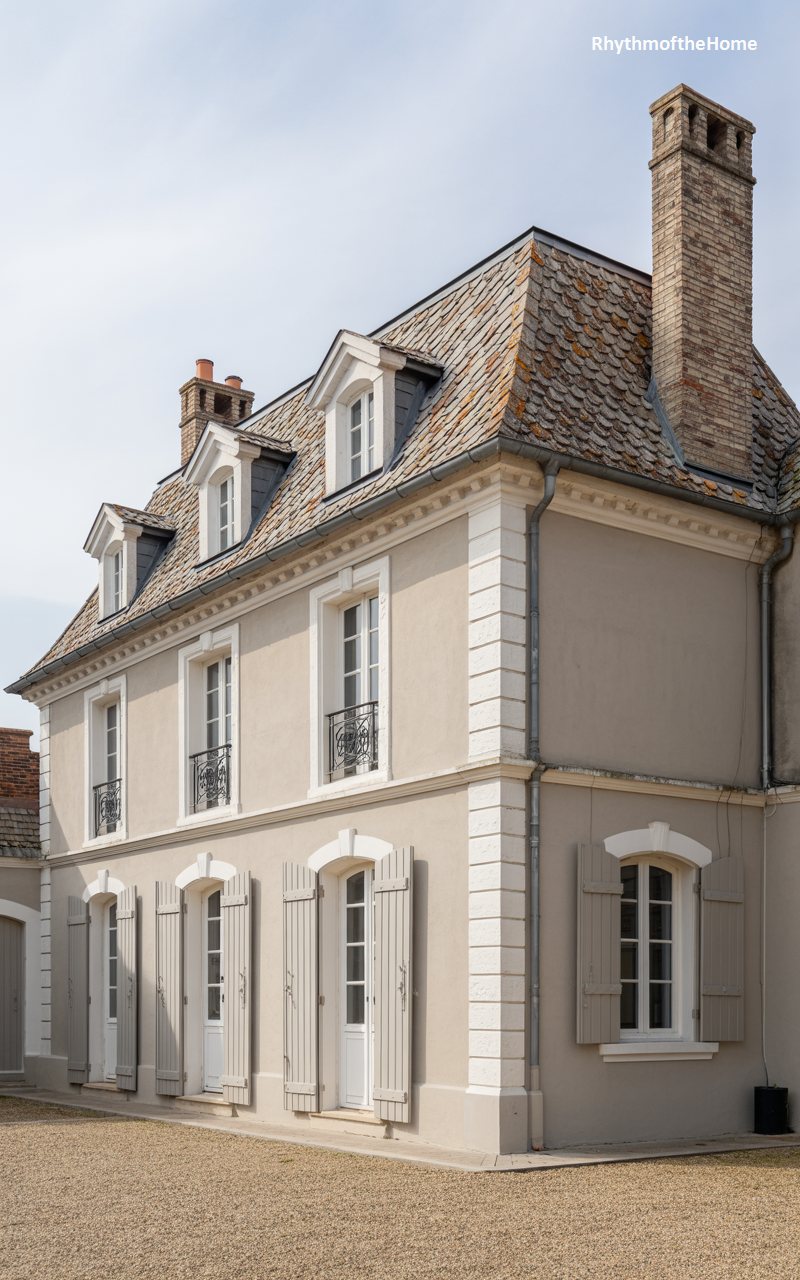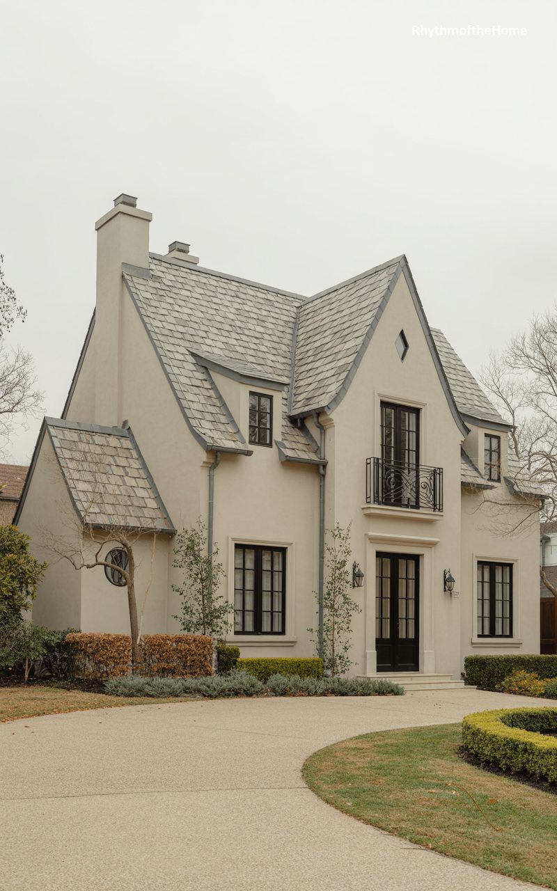 With its steep, slate-tiled roof and smooth cream stucco walls, this home evokes the charm of a French country manor. The facade is dominated by a large, steeply pitched gable that houses a tall arched window and a delicate iron balcony. To the right, a smaller wing balances the composition. The entrance is marked by double doors with glass panes, set within a simple stone surround. Manicured hedges and a curving driveway create a soft, elegant approach to the house, which feels both grand and intimately scaled.