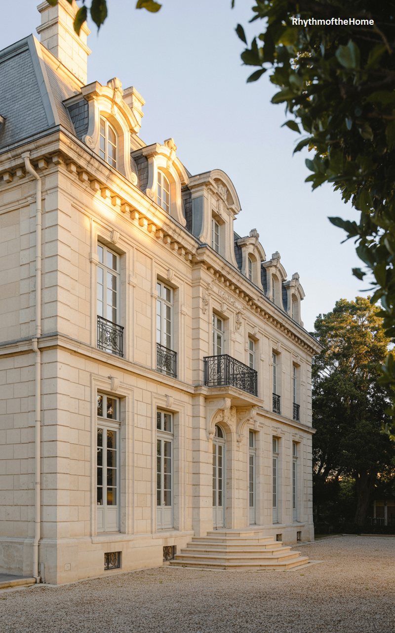 This mansion is a triumph of stone carving and classical design. The facade is constructed of pale, cream-colored stone, glowing softly in the evening light. A magnificent wrought iron balcony spans the central window on the second floor, adding intricate black detailing to the light stone. The windows are tall and framed by heavy stone surrounds. The roof is steep and slate, with elaborate dormers. It feels like a grand city residence or a country chateau, built with no expense spared, showcasing the skill of stonemasons and the timeless appeal of classical aesthetics.