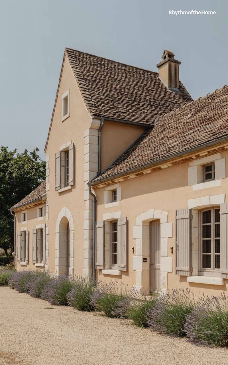 Rustic yet refined, this home features a warm, ochre-colored stucco facade that evokes the sun-baked architecture of the French countryside. The roof is covered in small, textured tiles, sloping steeply down to the eaves. Wooden shutters, painted a soft grey-brown, frame the windows. An arched doorway leads into the main volume, while a lower wing extends to the side. Rows of lavender and wild grasses line the gravel path, grounding the house in its natural setting. It is a home that feels warm, earthy, and inviting, perfect for a life lived close to the land.