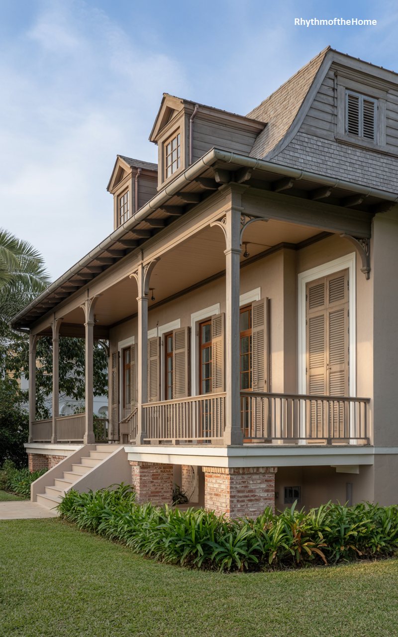 Deep, shadowed porches define this inviting home, offering a respite from the sun and a place to enjoy the outdoors. The exterior is painted a warm, earthy taupe, blending with the wooden columns and decking. The roof extends out to cover the veranda, supported by slender posts with decorative brackets. Louvered shutters cover the floor-to-ceiling windows, hinting at high ceilings and cross-ventilation. Set on a brick foundation, the house feels raised and airy. It is a quintessential example of architecture adapted for a warm climate, prioritizing shade, comfort, and a connection to the breeze.