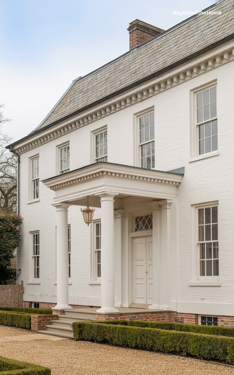 Elegance radiates from this pristine white brick residence, which showcases the refined restraint of the Federal style. The smooth, painted façade serves as a perfect canvas for the architectural details, such as the dentil molding running beneath the eaves and the slate roof above. A classical portico, supported by slender columns, protects the front entry and adds a sense of three-dimensional depth to the flat face of the home. A hanging lantern adds a touch of old-world charm. The surrounding landscape is kept minimal and green, allowing the stark, clean brightness of the house to stand out as a beacon of sophistication.