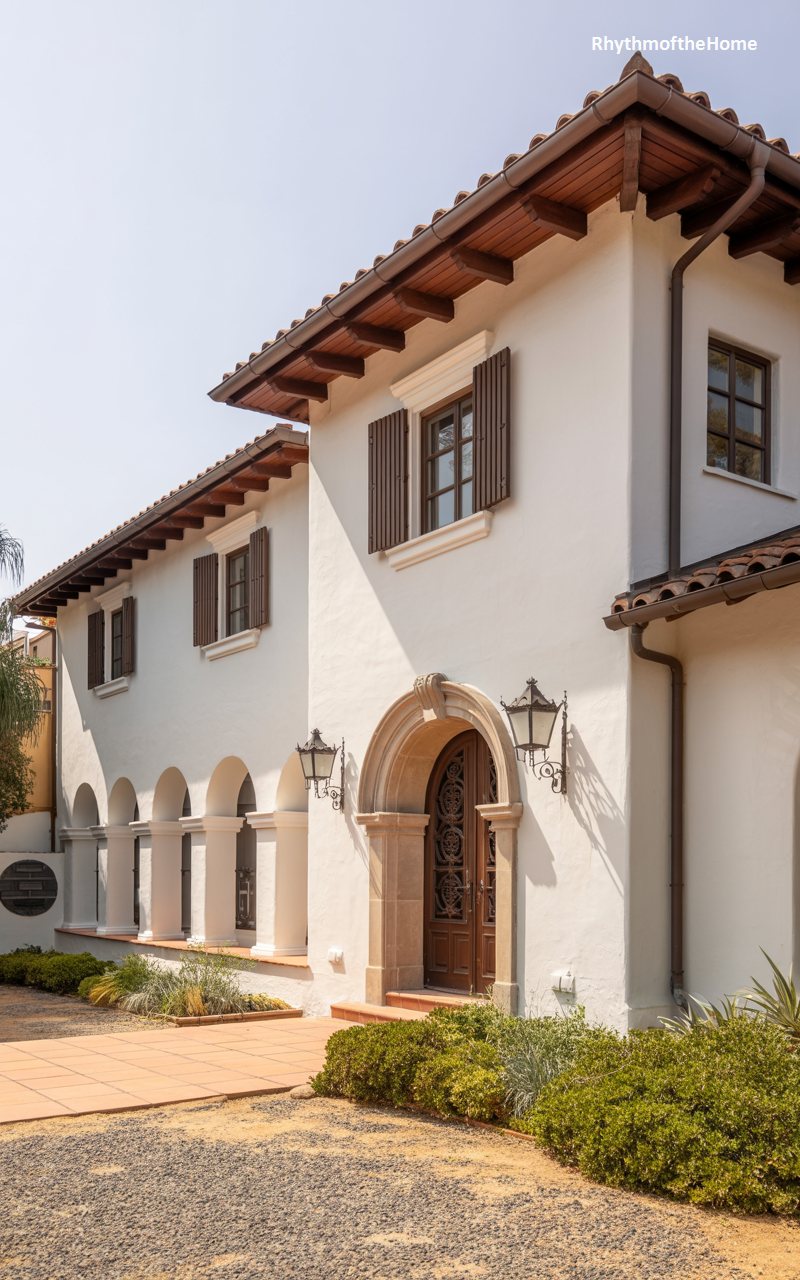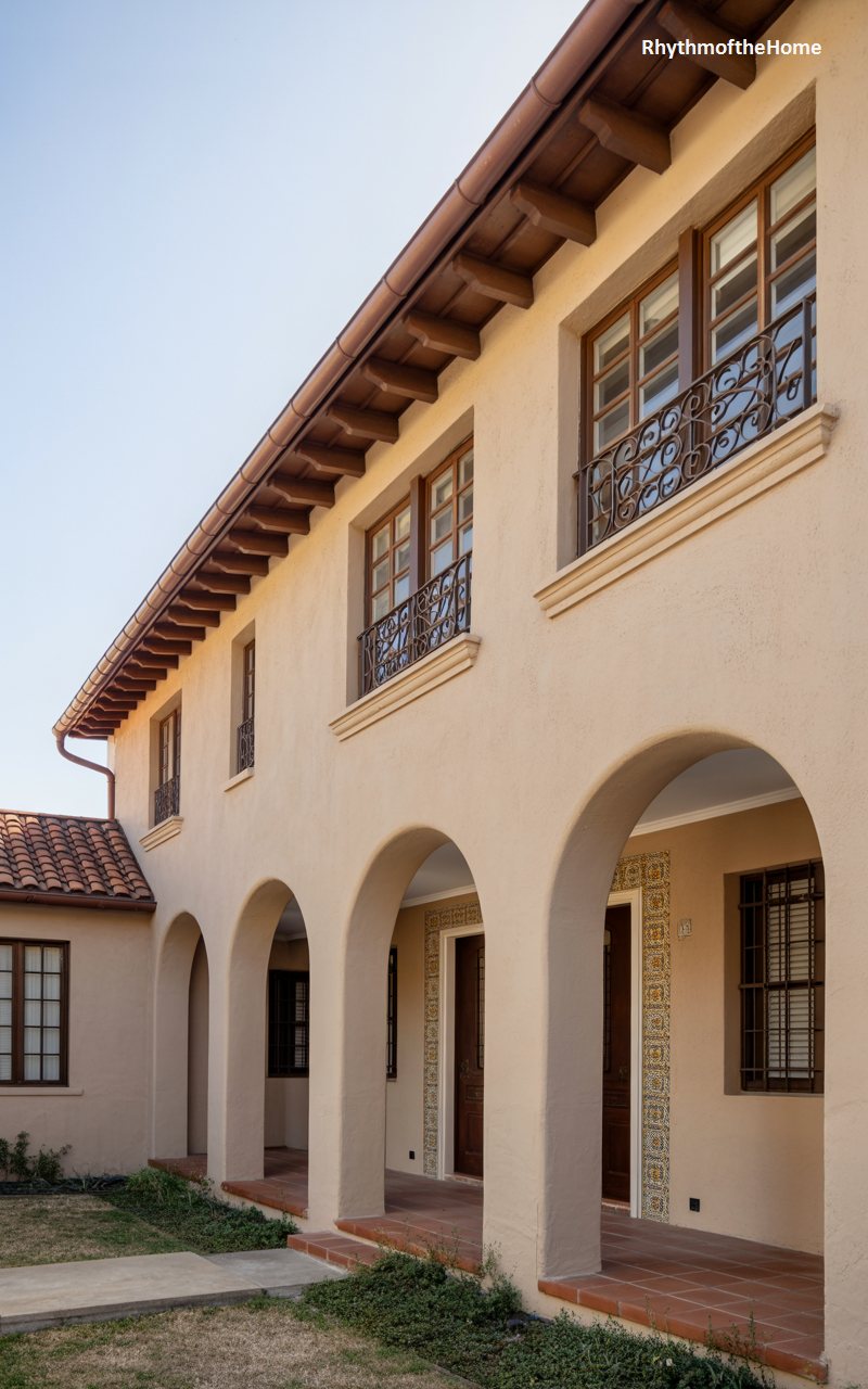 This perspective highlights the rhythmic beauty of the home’s long, arcaded walkway. The repeated arches create a captivating tunnel of light and shadow, guiding guests along the side of the residence. The facade is a textured warm beige, complemented by the rich, dark wood of the exposed roof rafters and the terracotta tiles above. Upper-story windows are dressed with decorative iron grilles, adding a layer of intricate detail to the otherwise clean planes of the walls. Beautiful tile work frames the doorways, injecting a splash of color and artistry that speaks to the home’s handcrafted, artisanal roots.