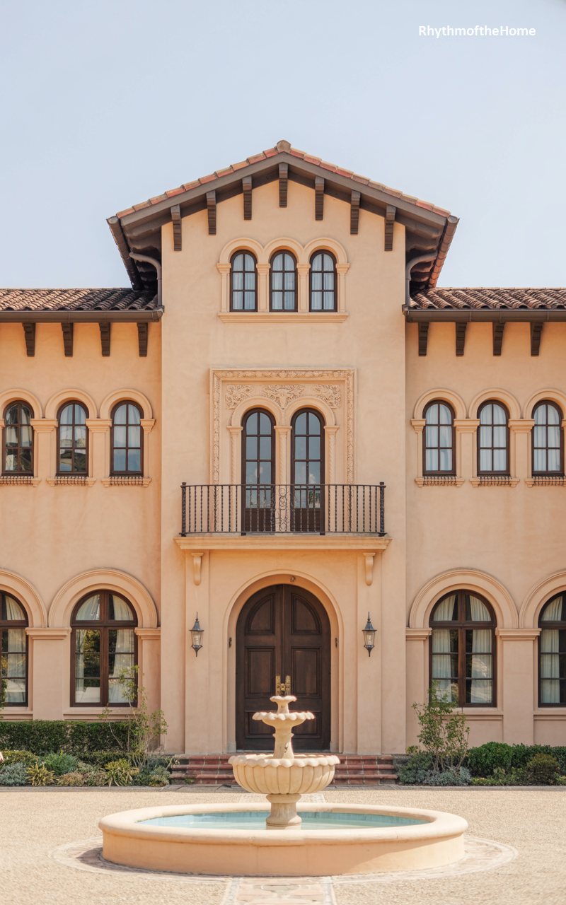 Symmetry and grandeur define this imposing facade, which draws heavily on Mediterranean influences to create a sense of nobility. The central volume of the house rises prominently, featuring a trio of arched windows on the upper level that sit above a delicate balcony. The entrance is marked by a massive, arched wooden door, flanked by wall-mounted lanterns that cast a warm glow. To the left, a wing of the house extends with arched windows, balancing the composition. A circular stone fountain in the foreground acts as an anchor for the expansive gravel driveway, leading the eye directly to the home’s impressive architectural centerpiece.