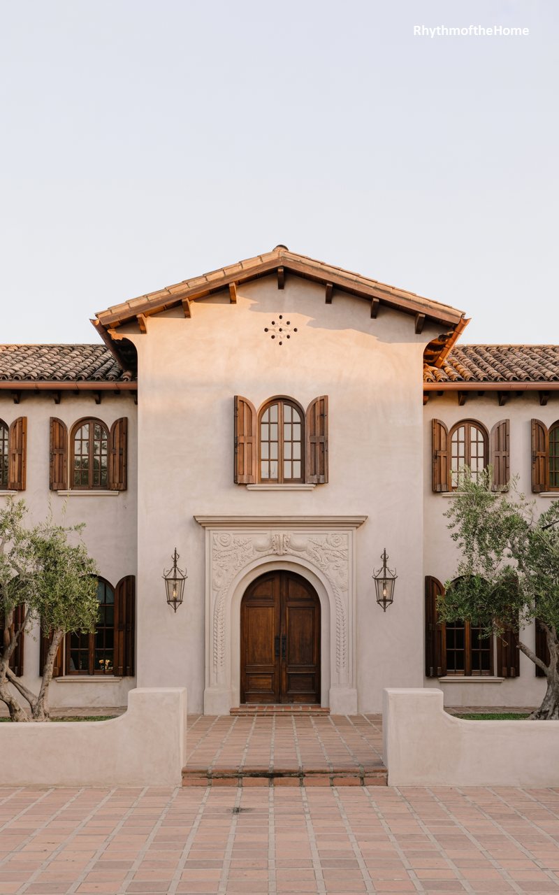 Bathed in the golden light of the late afternoon, this home exudes a sense of tranquility and permanence. The central focus is the magnificent entry surround, featuring intricate stone carvings that frame the arched wooden door in a display of craftsmanship. Flanking the entrance, tall windows with dark wooden shutters maintain the classical symmetry of the design. Iron lanterns mounted on the walls add a touch of old-world charm. The smooth stucco walls catch the shifting light, turning from bright white to a soft, warm cream, while the red tile roof creates a striking silhouette against the pale sky.