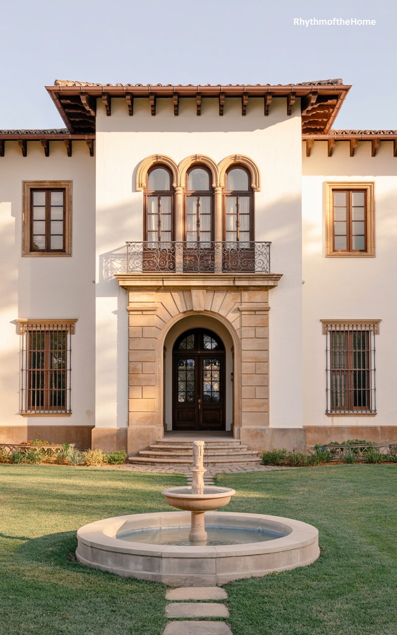 Elegance reigns supreme in this stately residence, where formal landscaping meets classical architecture. The facade is composed of warm stone or stucco, featuring a grand central archway with a recessed entry that creates a dramatic sense of depth. Above the door, a triple-window arrangement with a shared balcony adds vertical interest. To the left and right, large windows with iron grilles ensure the interior is flooded with light. In the foreground, a perfectly circular stone fountain sits within a lush, green lawn, its water mirroring the tranquility of the home. The composition is balanced, harmonious, and undeniably sophisticated.