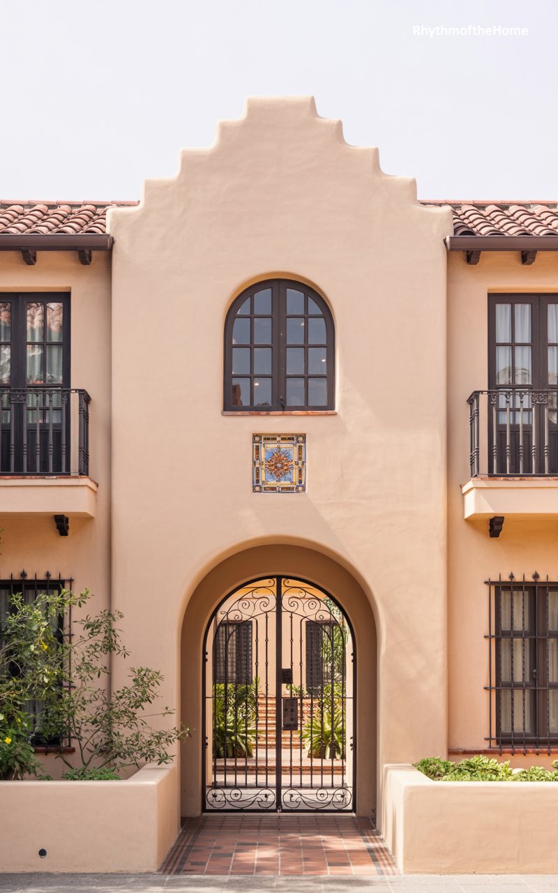 Drawing inspiration from Mission Revival styles, this home features a distinctive stepped parapet roofline that creates a dynamic silhouette against the sky. The smooth, peach-toned stucco is interrupted by a central arched window on the upper floor, creating a focal point above the entrance. A decorative tile mosaic is embedded in the wall above the main archway, adding a jewel-like detail to the facade. The entrance itself is set behind a decorative iron gate, leading into a recessed porch or courtyard. Flanking balconies with iron railings add depth and texture, making the home feel like a fortified yet welcoming sanctuary.