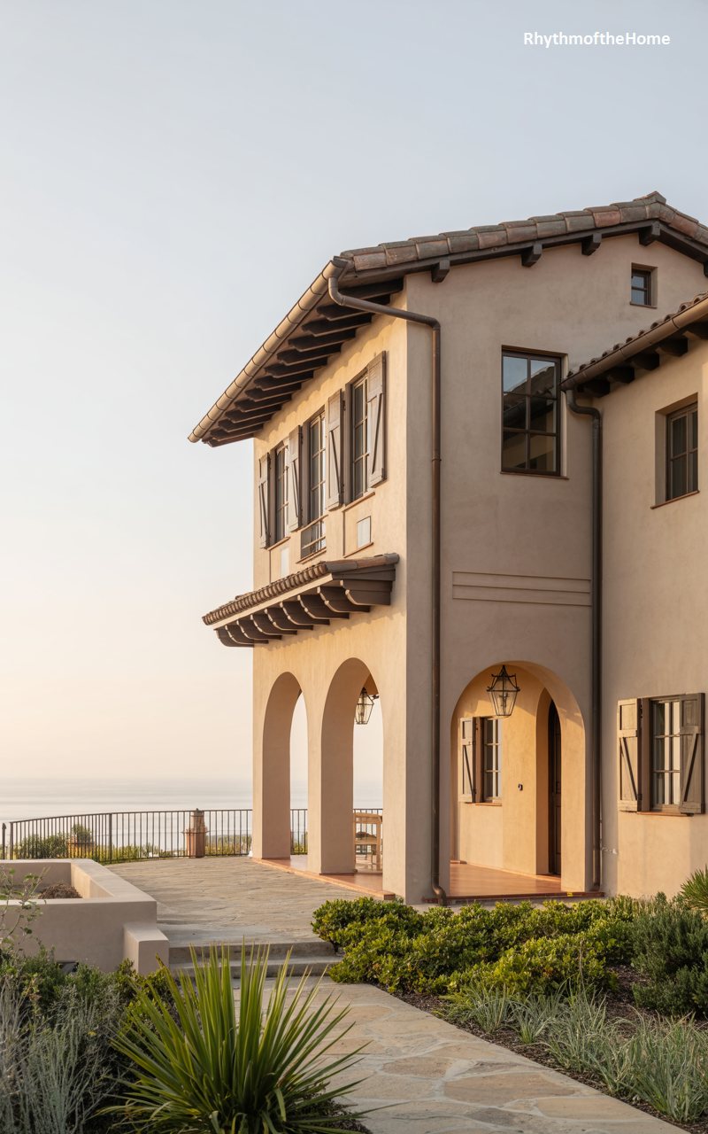 Perched in a location that suggests sweeping ocean views, this home combines height and elegance. The side profile reveals a towering facade with a deep, arched loggia on the ground floor, perfect for catching sea breezes. Above, a wooden balcony supported by heavy corbels extends from the building, offering a private outdoor retreat. The windows are tall and narrow, emphasizing the verticality of the structure. A long copper downspout runs down the side, acquiring a patina that matches the age of the design. The warm beige stucco and terracotta roof tiles glow in the soft light, evoking a Mediterranean villa by the sea.