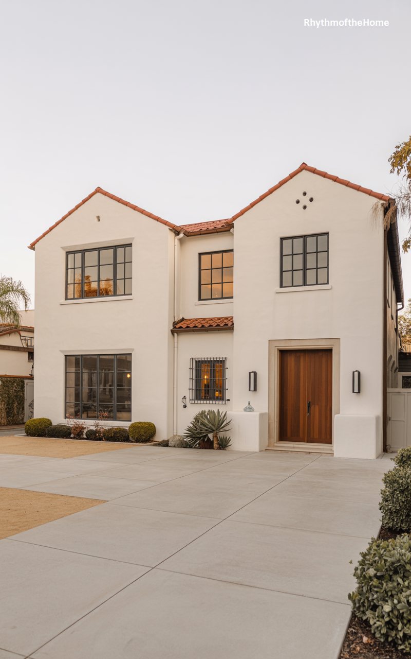 A contemporary interpretation of traditional forms, this home features stark white walls and a clean, minimalist aesthetic. The roof is clad in reddish-brown tiles, providing a classic contrast to the modern brightness of the facade. Black-framed windows add a sharp, graphic quality to the exterior, updating the look for the 21st century. The massing is simple, with two gabled sections flanking a central connection. A large, paved driveway leads up to the entrance, emphasizing the spaciousness of the property. The landscaping is restrained, with low shrubs and succulents, allowing the pristine architecture to take center stage.