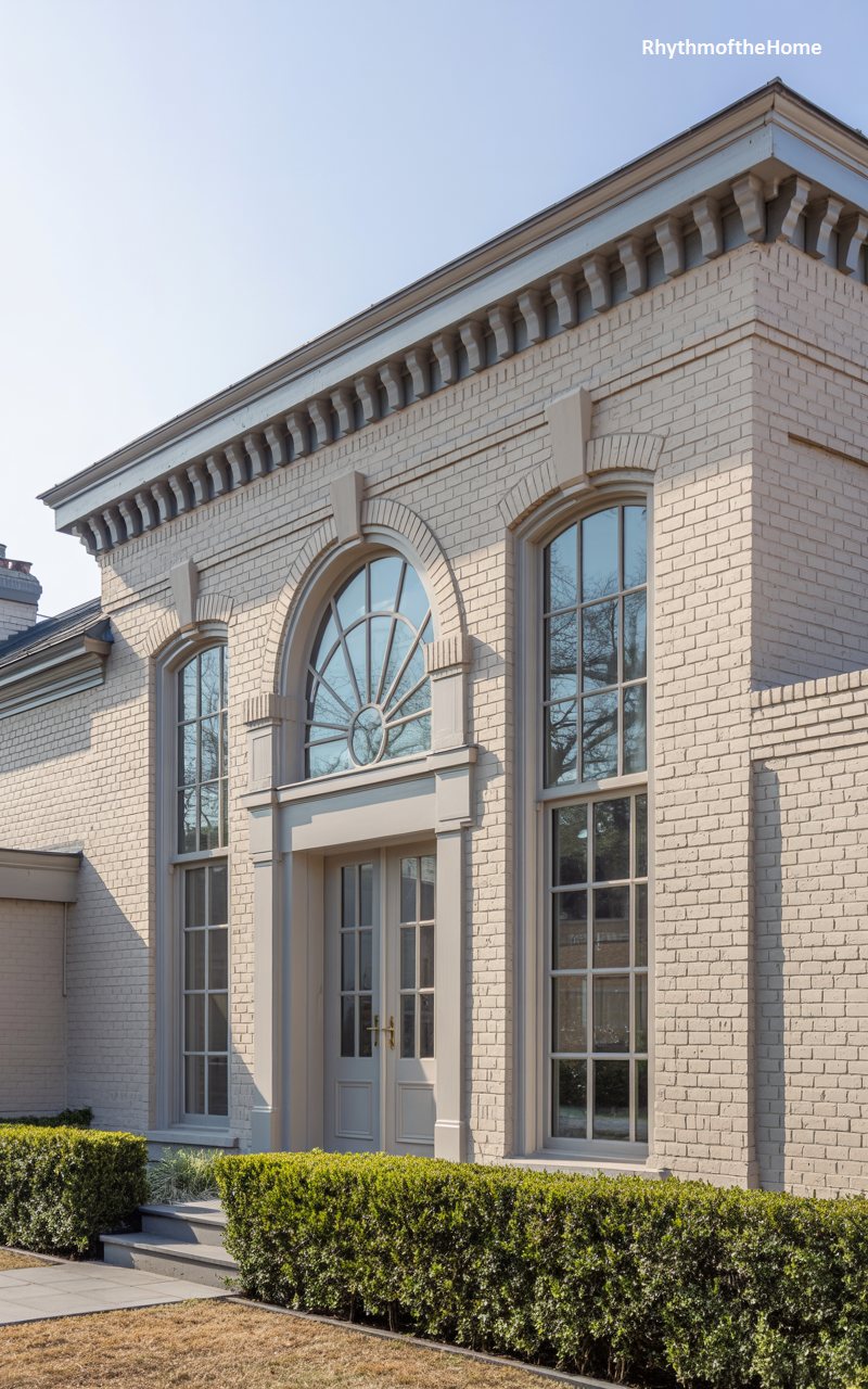 Reflecting a more urban or Italianate influence, this building features painted brick walls in a soft, sandy hue. The facade is dominated by three magnificent, double-height arched windows that flood the interior with light. The arches are detailed with radiating brickwork, adding texture and visual interest. A prominent, decorative cornice with bracket detailing runs along the flat roofline, crowning the structure. The entrance is comprised of double doors with glass panes, mirroring the grid pattern of the windows above. Neatly trimmed boxwood hedges line the base, providing a touch of greenery to the sophisticated, hardscaped exterior.