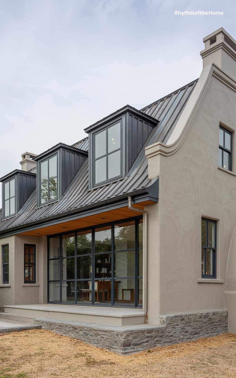 This home represents a fusion of traditional cottage shapes and modern industrial materials. The exterior is finished in a textured, earthy stucco, while the steeply pitched roof is clad in dark gray standing-seam metal. Three dormer windows protrude from the roof, adding volume to the upper story. The ground floor features an expansive wall of black steel-framed glass windows and doors, opening the living space entirely to the outdoors. A low stone wall forms the base of the terrace, grounding the modern structure in natural materials. It is a stylish blend of the old and the new, feeling both cozy and expansive.