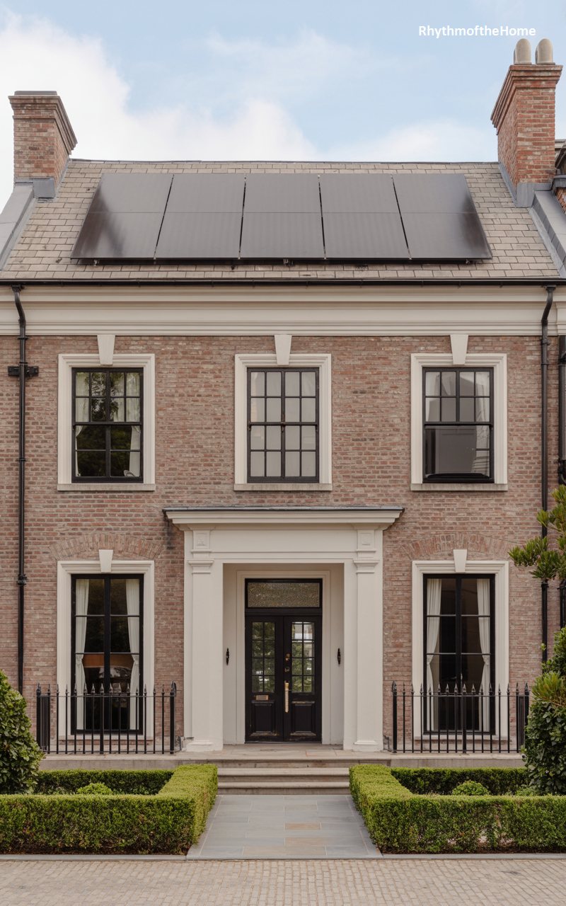 A classic example of red-brick Georgian architecture, this home has been updated for the modern era. The facade is strictly symmetrical, with five bays of sash windows across the top and bottom floors. Stone lintels and a white cornice provide crisp contrast to the red brick. The central entrance is framed by a white portico with pilasters and a pediment, a hallmark of the style. The roof, paved in slate, is fitted with a large array of solar panels, signaling a commitment to sustainability without compromising the historical integrity of the design. It is a dignified, timeless home that embraces the future.