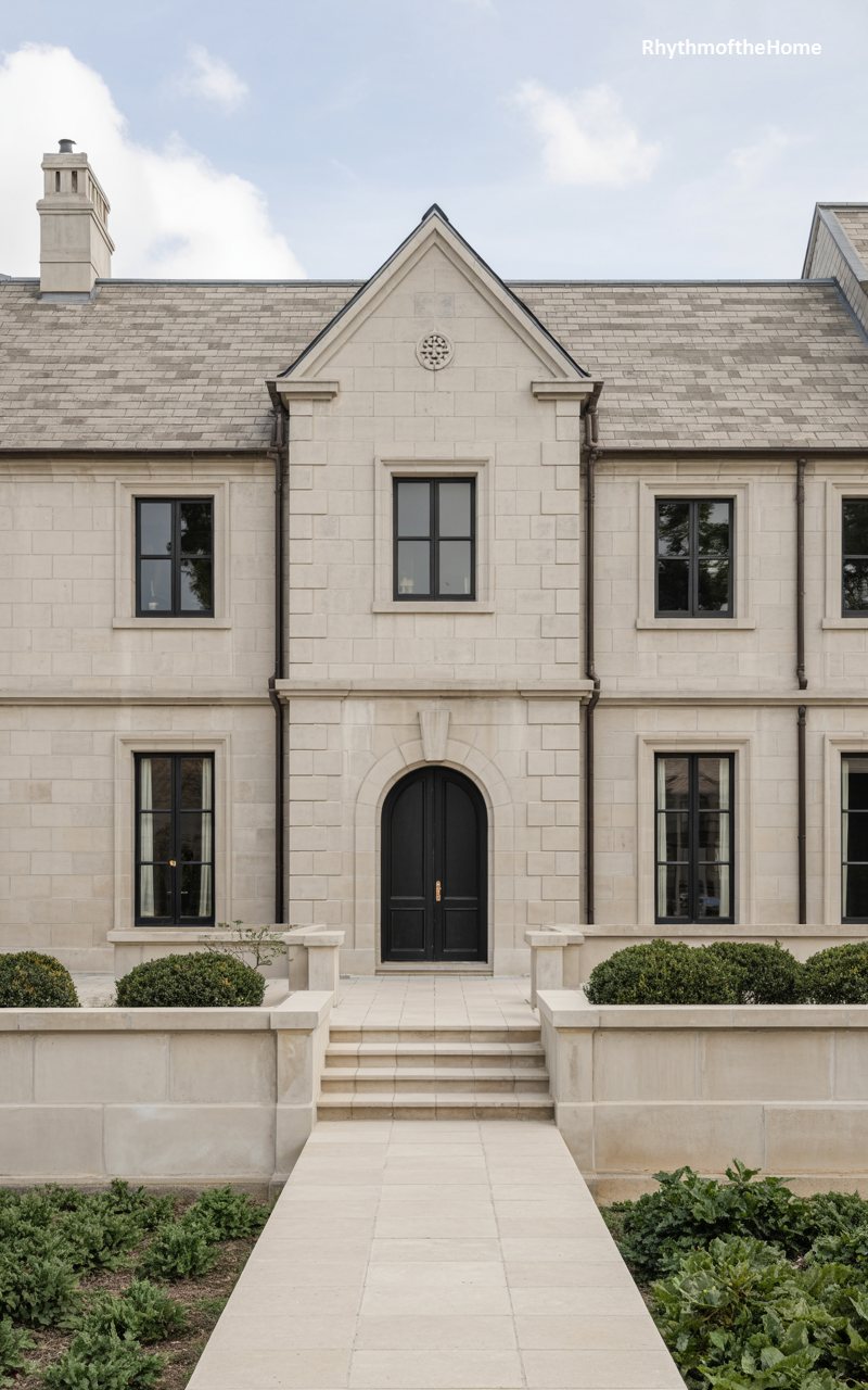 Built from smooth, pale limestone blocks, this home carries the weight and presence of a historic manor. The design is anchored by a steep, central gable and a high, slate-clad roof. The entrance is a standout feature, set within a deeply recessed, pointed archway that hints at Gothic Revival influences. Flanking the door are symmetrical windows with dark frames, keeping the look balanced. The landscaping is formal, with manicured round bushes lining a stone retaining wall in the foreground. A paved walkway leads directly to the front door, inviting visitors into a space that feels solid, enduring, and meticulously crafted.