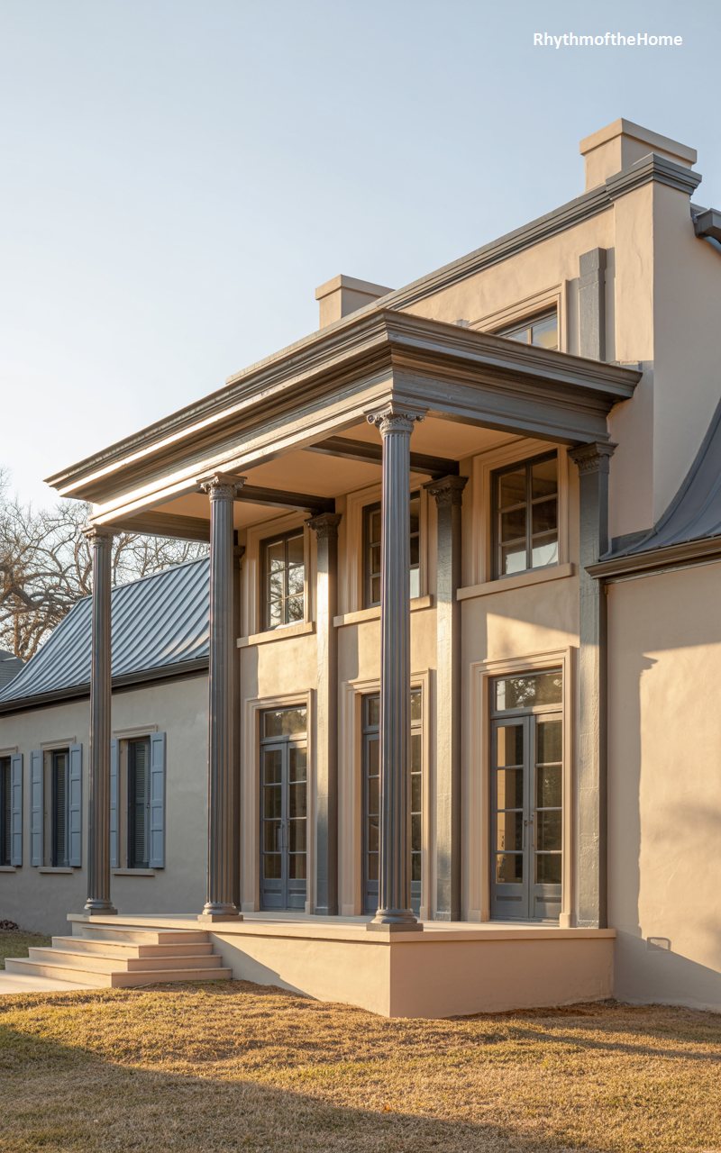 Dominating the landscape with its massive, fluted columns, this home is a striking example of Greek Revival influence. The deep portico runs the full height of the two-story structure, creating a dramatic, sheltered outdoor living space. The facade is painted in a warm, monochromatic beige, blending the walls with the trim. Tall, narrow windows and doors on both levels allow for ample airflow and light. The roof is a dark grey metal, providing a visual cap to the soaring vertical lines of the columns. The setting, with sunlight hitting the side, highlights the depth and grandeur of this architectural statement.