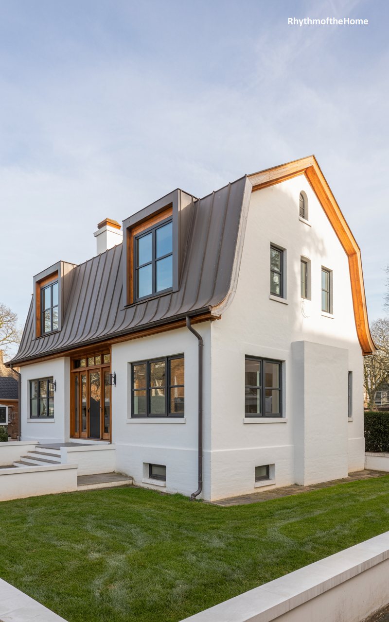 This charming residence utilizes a distinctive gambrel roofline, often associated with Dutch Colonial architecture. The roof is clad in standing-seam metal with a warm, bronze-like patina, curving gracefully as it meets the eaves. The walls are a crisp white painted brick or stucco, providing a bright contrast to the dark roof and window frames. Dormer windows break up the roofline, adding light to the upper floor. The landscaping is lush and green, with a well-maintained lawn and paved walkway. It is a playful yet sophisticated design that feels both historic and freshly contemporary.