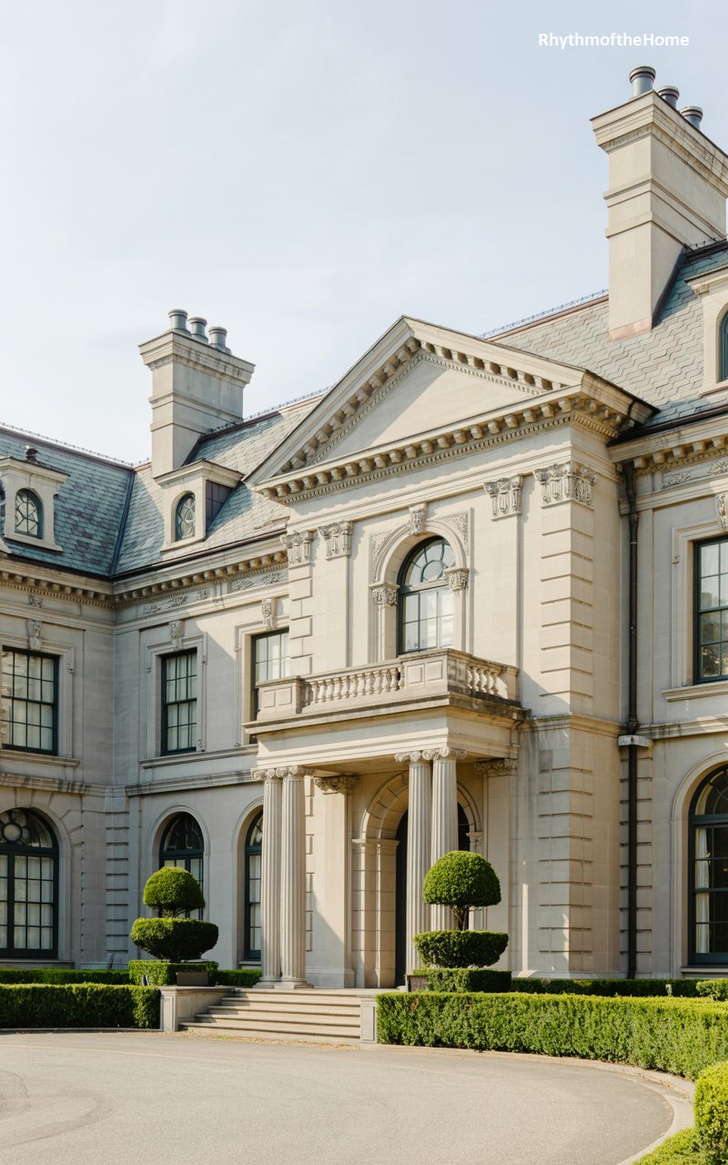 Grandeur is the defining characteristic of this imposing limestone estate. The façade is an intricate display of classical elements, from the heavy quoins at the corners to the elaborate balustrade and pediment above the entrance. The stone is smooth and pale, glowing softly in the light, while the arched window above the balcony adds a touch of romance. Manicured topiaries in conical shapes stand like sentinels on the lawn, reinforcing the strict formality of the design. This is a home built to impress, combining the massing of a colonial estate with the ornate detailing of the Beaux-Arts or Neoclassical tradition.