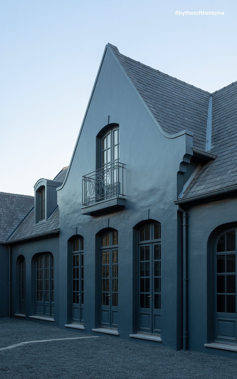 Strike and moody, this home features a deep blue-grey smooth stucco finish that makes it stand out dramatically. The central gable has a curved, Flemish-style parapet, adding a touch of European flair. A small balcony with an intricate iron railing sits beneath an arched upper window. On the ground floor, three tall arched doorways with glass panes open onto a gravel courtyard, suggesting a connection between the interior and the garden. The roof is slate, matching the dark, cool tones of the walls. It is a sophisticated, somewhat mysterious architectural gem that feels tailored and unique.