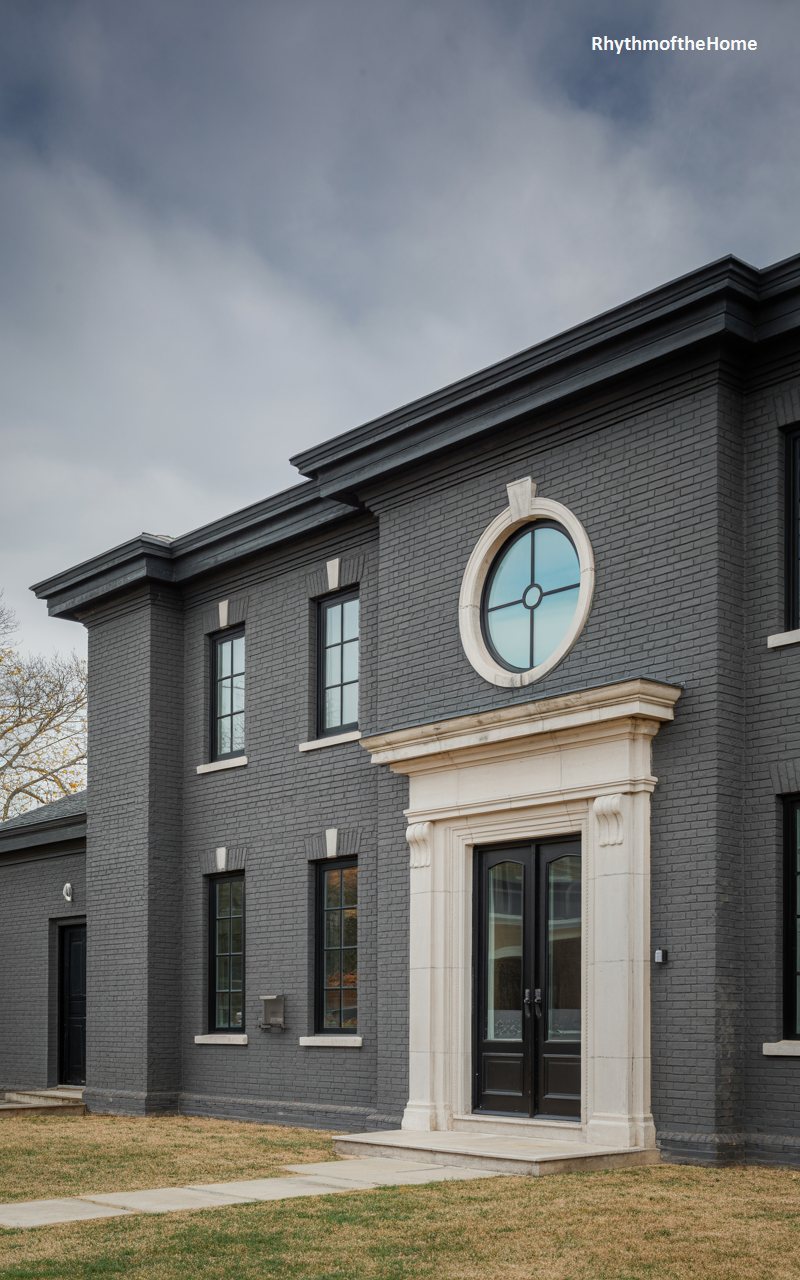 The exterior of this home is defined by its dark grey painted brick, which gives it a sleek, modern, and substantial appearance. The most striking feature is the circular “oculus” window situated directly above the main entrance, creating a focal point of geometric contrast. The entryway itself is surrounded by a massive, light-colored limestone casing with classical detailing, which pops against the dark brick. Double glass doors with dark frames welcome visitors. To the left, a single-story wing extends, maintaining the same dark palette. The overall effect is one of bold contrast and modern luxury.