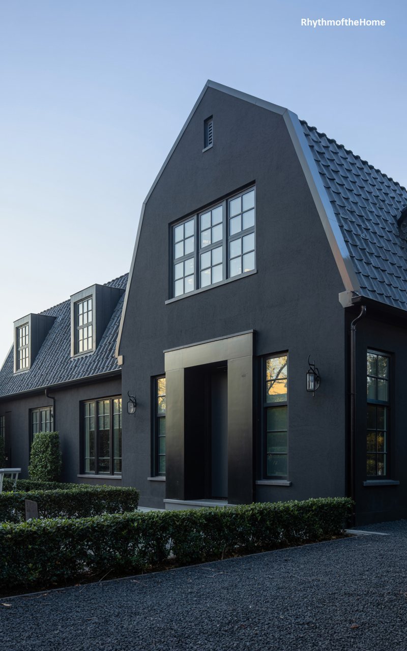 This home takes the traditional gabled form and creates a bold statement by drenching it in black. The steep, tiled roof flows seamlessly into the dark stucco walls, creating a unified, monolithic silhouette. The front facade features a large, multi-paned window on the upper level and a very modern, box-like entry portal on the ground floor. The deep black finish absorbs the light, making the glass of the windows reflect the surroundings intensely. Surrounded by green hedging and a gravel driveway, the house feels like a modern sculpture, redefining what a traditional home silhouette can look like.