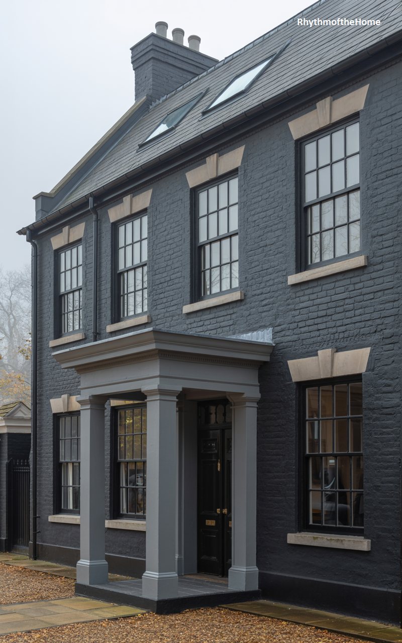 A study in grayscale elegance, this home features textured brick walls painted in a deep charcoal hue. The slate roof matches the walls, creating a cohesive, moody palette. The windows are traditional sash style but painted black to blend with the facade, framed by lighter stone sills and headers that provide subtle definition. A prominent entrance portico with columns and a heavy entablature projects from the front, sheltering the glossy black front door. It is a classic Georgian shape updated with a contemporary, monochromatic color scheme that feels urban and chic.