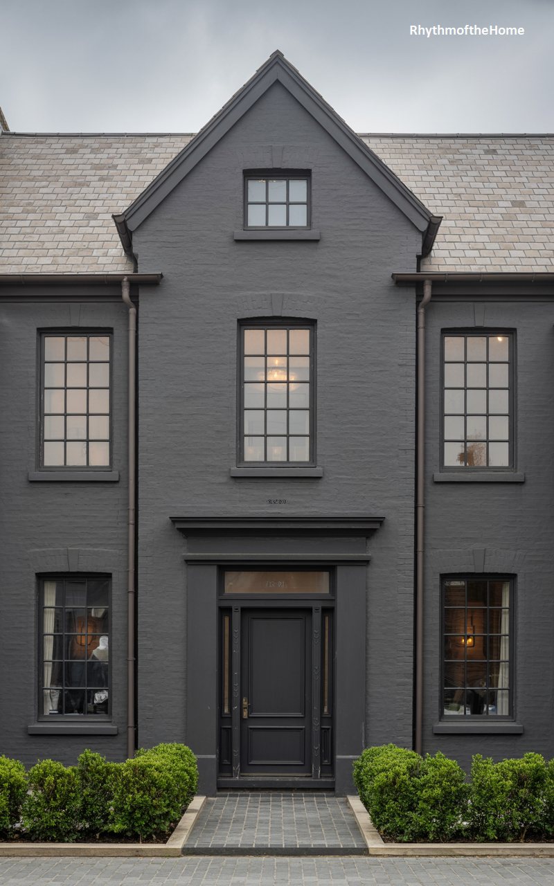 This final image showcases a home with a powerful, symmetrical presence. The dark grey painted brick and slate roof create a solemn, dignified atmosphere. A central gable rises to a peak, housing a small square window near the top and a larger rectangular window below. The entrance is centered at the bottom, framed by dark molding and flanked by narrow sidelights. Two large windows on either side of the central bay complete the balance. Neatly trimmed bright green boxwood bushes line the front, providing a vibrant pop of color against the dark, imposing facade of the residence.