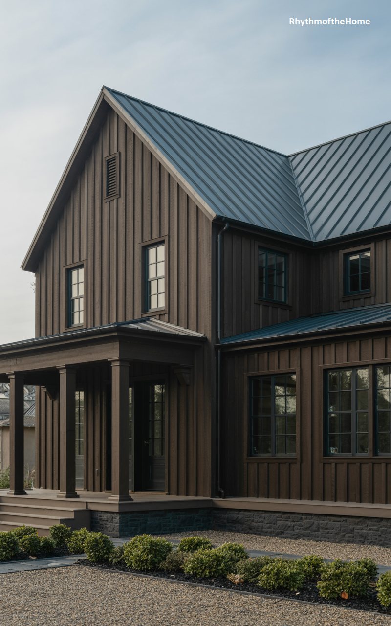 This striking residence offers a moody, contemporary twist on the farmhouse aesthetic. Clad entirely in vertical board-and-batten siding painted a deep, rich chocolate brown, the home feels grounded and substantial. A dark metal standing-seam roof matches the siding, creating a monochromatic silhouette against the pale sky. The deep front porch, supported by sturdy square columns, provides a shadowed retreat, while tall, narrow windows with dark muntins maintain the vertical rhythm of the design. A crisp gravel driveway and low-lying green shrubs add texture to the foreground, completing this sophisticated, rustic-modern composition.