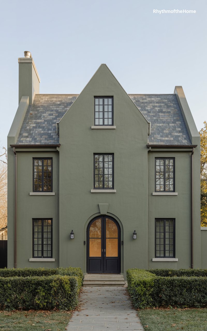 Defined by its sharp, steep gables and soothing palette, this home exudes a French-influenced elegance. The exterior is rendered in a smooth stucco, painted a soft, earthy sage green that harmonizes beautifully with the slate-tiled roof. Symmetry plays a key role here, with a central gable rising above an arched entryway, flanked by balanced windows on either side. The entry itself features double doors set within a deep arch, softening the angularity of the roofline. Manicured boxwood hedges line the stone walkway, guiding the eye toward the welcoming, warm-lit interior visible through the glass.