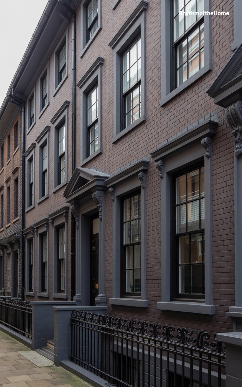 Standing tall within a city streetscape, this townhouse exemplifies the verticality and order of urban colonial architecture. The facade is constructed of dark, brownish-purple brick, providing a textured, historic backdrop for the crisp, dark grey detailing of the window frames and cornice. Tall sash windows dominate the upper stories, ensuring ample light reaches the interior. The ground floor features a classic pedimented doorway and a black iron railing that guards the lower level, adding a layer of security and traditional ornamentation. It is a dignified structure that speaks of history and permanence in a bustling environment.
