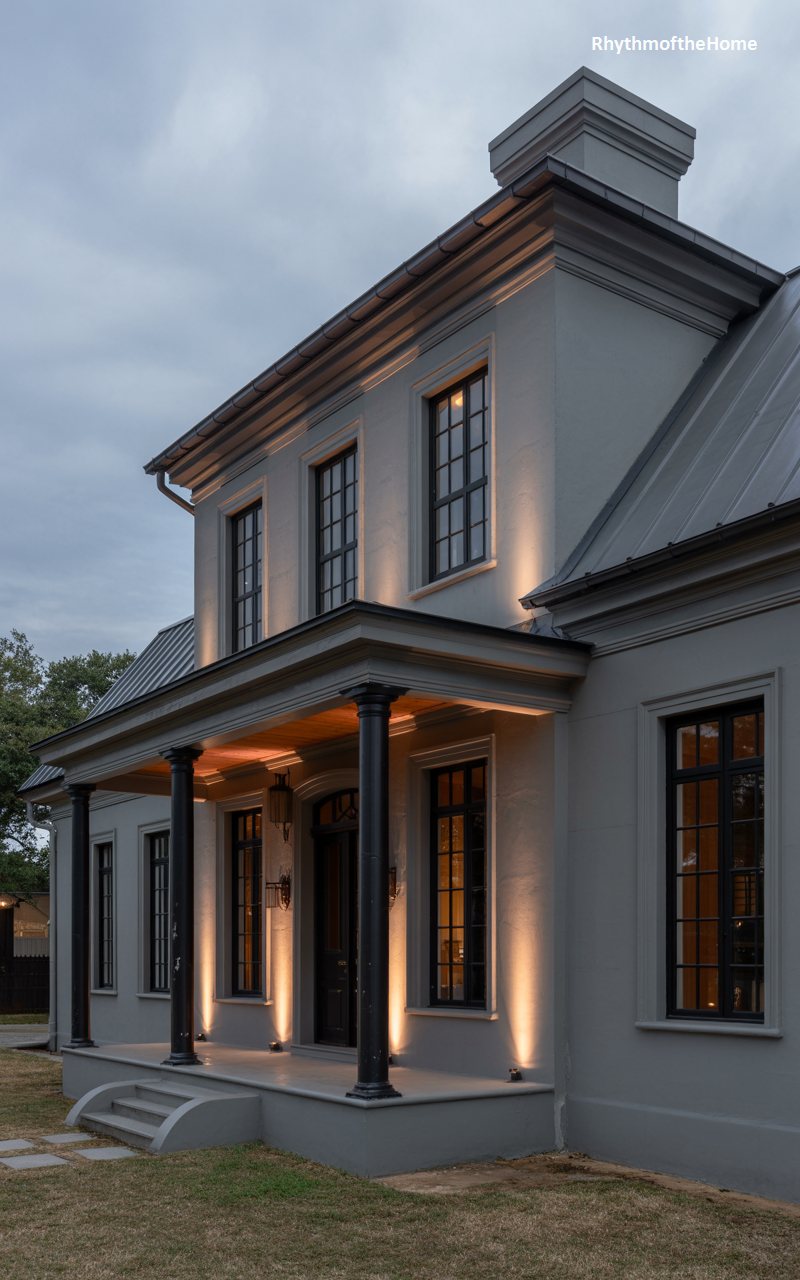 Captured at twilight, this home showcases the dramatic effect of exterior lighting on painted brick. The facade is a uniform, cool grey, which serves as a canvas for the warm up-lighting that grazes the walls and highlights the texture of the masonry. A standing-seam metal roof adds a sleek, industrial touch to the traditional form. The deep front porch, supported by simple columns, glows invitingly, suggesting a comfortable transition between the outdoors and the interior. The landscaping is minimal but effective, with the green lawn providing a vibrant contrast to the monochromatic house.